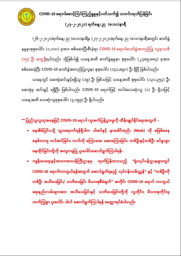 COVID-19 ရောဂါစောင့်ကြပ်ကြည့်ရှုမှုနှင့် ပတ်သက်၍ သတင်းထုတ်ပြန်ခြင်း (27-2-2021, 8:00 PM)