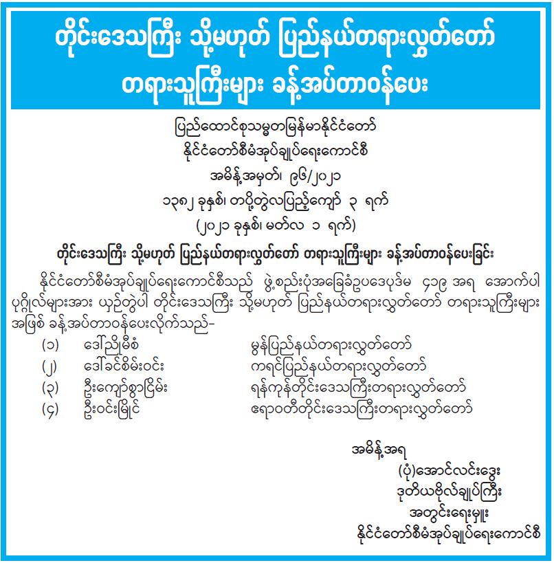 တိုင်းဒေသကြီး သို့မဟုတ် ပြည်နယ်တရားလွှတ်တော် တရားသူကြီးများ ခန့်အပ်တာဝန်ပေး