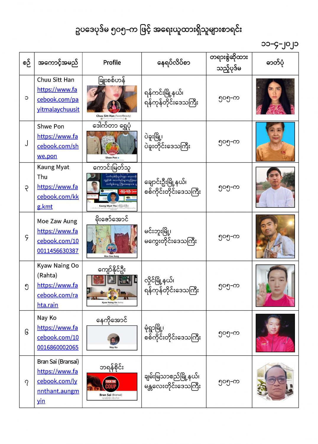 နိုင်ငံတော်၏ အုပ်ချုပ်မှုယန္တရားပျက်ပြားစေရန်ရည်ရွက်ချက်ဖြင့် နိုင်ငံ့ဝန်ထမ်းများအား CDM လှုပ်ရှားမှုတွင် ပါဝင်စေရန်လှုံ့ဆော်ခြင်း၊ CRPH မတရားအသင်းအား ထောက်ခံသည့် အကြောင်းအရာများ၊ မမှန်သတင်းများအားဖြန့်ဝေခြင်း၊ နိုင်ငံတော်တည်ငြိမ်အေးချမ်းမှုကို ပျက်ပြားစေပြီး ဆူပူအုံကြွမှုဖြစ်ပေါ်စေရန်နှင့် အများပြည်သူအထိတ်တလန့်ဖြစ်စေရန် အတွက် သွေးထိုးလှုံ့ဆော်မှုများပြုလုပ်ခြင်း၊ Social Punishment ပြုလုပ်ခြင်းများကို လူမှုကွန်ရက် စာမျက်နှာများတွင် ရည်ရွယ်ချက်ရှိရှိ ဖြင့်ဖော်ပြခြင်းနှင့် ဖြန့်ဝေခြင်းများ ဆောင်ရွက် လျက်ရှိသည့် အောက်ဖော်ပြပါ အနုပညာရှင်အချို့နှင့် အခြားပါဝင်ပတ်သက်သူများအား ရာဇသတ်ကြီးပုဒ်မ ၅၀၅-က ဖြင့် အမှုဖွင့်အရေးယူ ဆောင်ရွက်လျက်ရှိပါသည်။