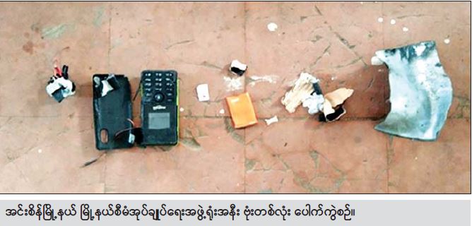 အလားတူ ဧပြီလ ၂၀ ရက် နံနက် နာရီ ၄၀ မိနစ်အချိန်တွင် ရန်ကုန်တိုင်းဒေသကြီး၊ အင်းစိန်မြို့နယ်၊ ရွာမအရှေ့ ရပ်ကွက်၊ အောက်မင်္ဂလာဒုံလမ်းရှိ မြို့နယ်စီမံအုပ်ချုပ်ရေးအဖွဲ့ရုံး အနောက်ဘက်ဝင်ပေါက် အုတ်တံတိုင်းအနီး ဗုံး လုံးပေါက်ကွဲကြောင်း သတင်းအရ လုံခြုံရေး တပ်ဖွဲ့ဝင်များက သွားရောက်စစ်ဆေးခဲ့ရာ အဆိုပါနေရာတွင် Ooredoo ဆင်းကတ်ထည့်ထားသော Keypad ဖြင့် ပြုလုပ်ထားသည့် လက်လုပ်အသံမိုင်းဖြစ်ကြောင်း သိရှိရပြီး ပေါက်ကွဲမှုကြောင့် လူနှင့် အဆောက်အဦ ထိခိုက်ပျက်စီးမှုမရှိကြောင်း သိရသည်။