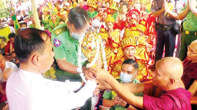 ထို့နောက် တိုင်းမှူးနှင့် တာဝန်ရှိသူများက သမိုင်းဝင်မမကြီးစေတီ တော်မြတ်ကြီးတွင် တင်လှူ ပူဇော်မည့် ရွှေထီးတော်၊ ငှက်မြတ်နားတော်၊ စိန်ဖူး တော်နှင့် လှူဖွယ်ပစ္စည်းများကို သံဃာတော်များ ထံသို့ ဆက်ကပ် လှူဒါန်းကြပြီး ပေါင်မြို့နယ် သံဃ နာယကအဖွဲ့ဥက္ကဋ္ဌ ဆရာတော်ဘဒ္ဒန္တပညာသာမိထံမှ အနုမောဒနာ တရားနာ ယူကာ ရေစက်သွန်းချ အမျှပေးဝေကြသည်။
