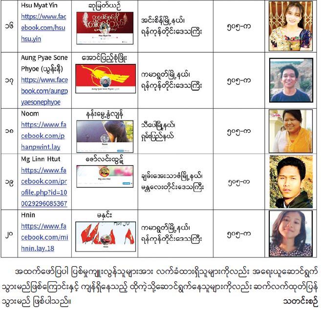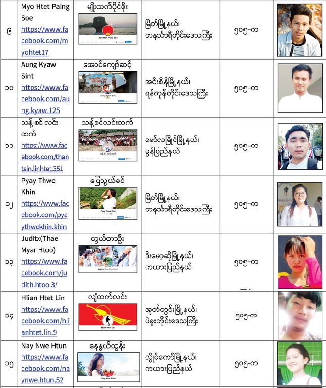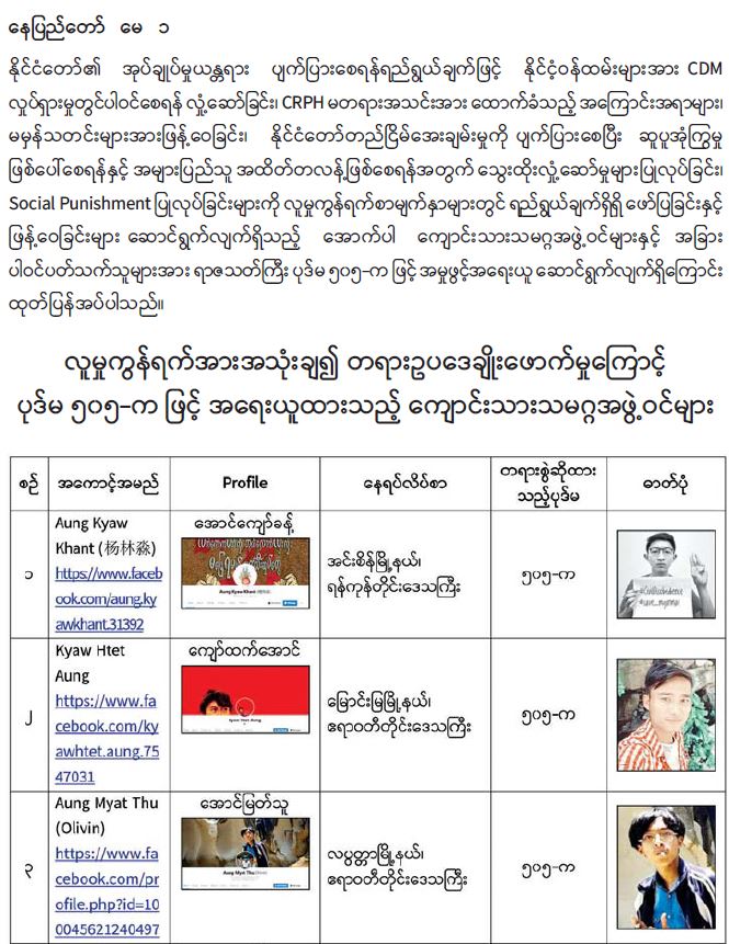 လူမှုကွန်ရက်အားအသုံးပြု၍ နိုင်ငံတော်တည်ငြိမ်အေးချမ်းမှုကို ပျက်ပြားစေရန် ရည်ရွယ်ချက်ဖြင့် လှုံ့ဆော်ခဲ့သည့် တက္ကသိုလ်/ကောလိပ်ကျောင်းများရှိ ကျောင်းသားသမဂ္ဂ အဖွဲ့ဝင်များအား ၅၀၅-က ဖြင့် အမှုဖွင့်အရေးယူဆောင်ရွက် 05/02/2021