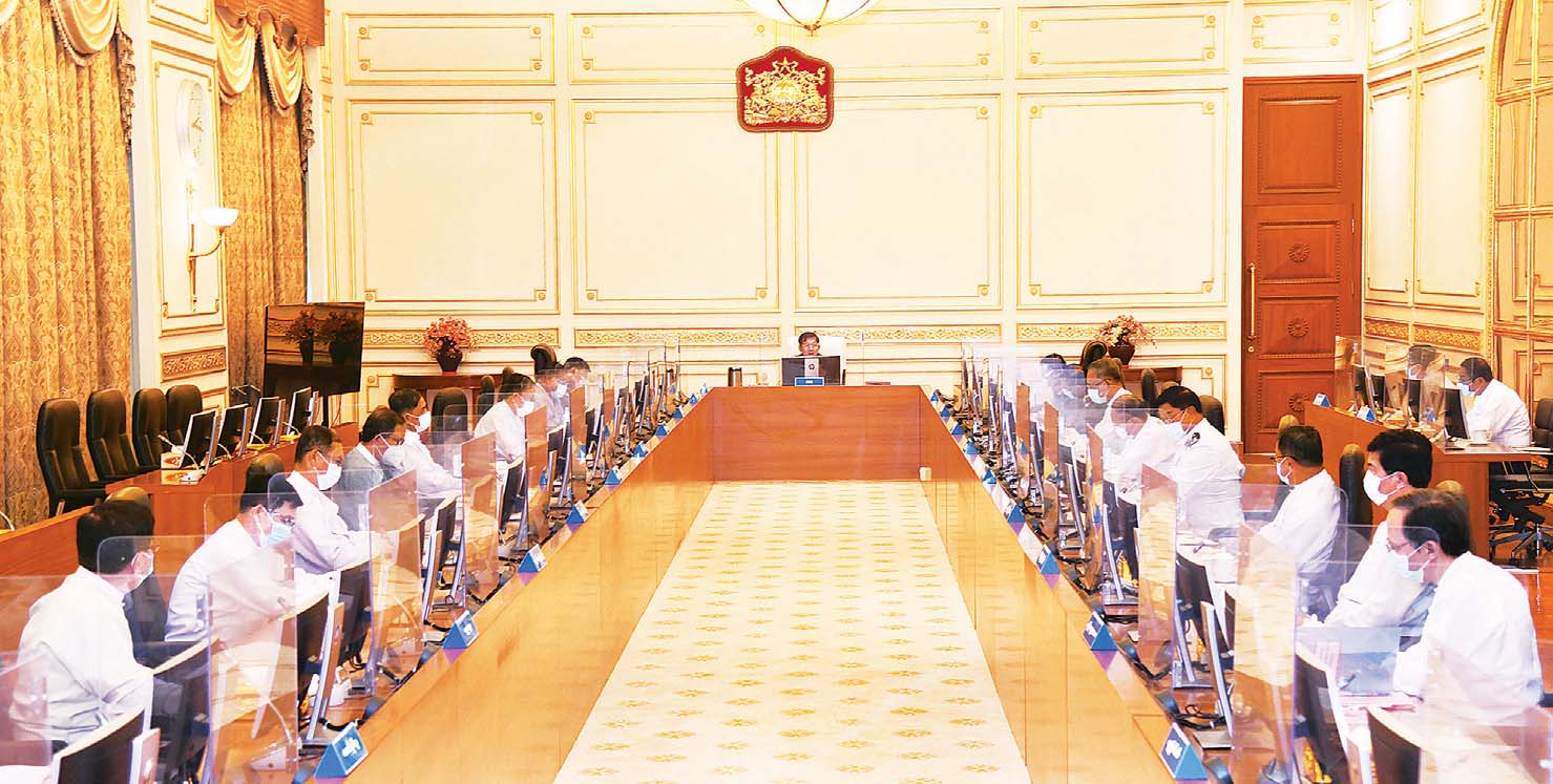 နိုင်ငံတော်စီမံအုပ်ချုပ်ရေးကောင်စီ စီမံခန့်ခွဲရေး ကော်မတီ အစည်းအဝေး (၆/၂၀၂၁) ကို ယနေ့မွန်းလွဲပိုင်းတွင် နေပြည်တော်ရှိ နိုင်ငံတော်စီမံအုပ်ချုပ်ရေး ကောင်စီဥက္ကဋ္ဌရုံး အစည်းအဝေး ခန်းမ၌ ကျင်းပရာ နိုင်ငံတော်စီမံအုပ်ချုပ်ရေးကောင်စီ ဥက္ကဋ္ဌ၊ တပ်မတော်ကာကွယ်ရေးဦးစီးချုပ် ဗိုလ်ချုပ်မှူးကြီး မင်းအောင်လှိုင် တက်ရောက်အမှာစကား ပြောကြားသည်။