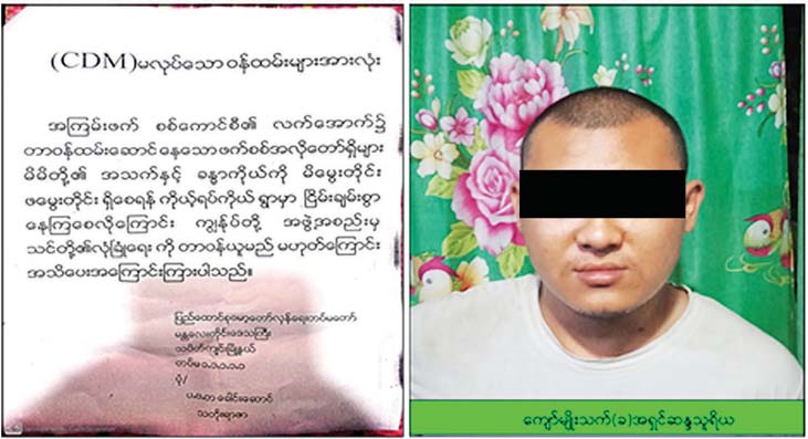 ထိုသို့ဆောင်ရွက်ခဲ့ရာ မေလ ၅ ရက်နေ့ ညနေ ၅ နာရီအချိန်တွင် မန္တလေးတိုင်းဒေသကြီး၊ သပိတ်ကျင်းမြို့နယ်၊ (၄) မိုင်၊ (၅) မိုင်နှင့်(၆) မိုင်ကျေးရွာများတွင် CDM မလုပ်သော ဝန်ထမ်းများ အား ခြိမ်းခြောက်အကြပ်ကိုင်သည့် စာသားပါ လက်ကိုင် စာရွက်များ လိုက်လံဖြန့်ဝေနေကြောင်း သတင်းအရ လုံခြုံရေးတပ်ဖွဲ့ဝင်များက လိုက်လံရှာဖွေဖမ်းဆီးရာ ပေသောင်ကျေးရွာအနီး သဲသောင်ပြင်အရောက်၌ မသင်္ကာသူ အမျိုးသား ၁ ဦးအား တွေ့ရှိရသဖြင့် စစ်ဆေးရာ မန္တလေးတိုင်းဒေသကြီး၊ မဟာအောင်မြေမြို့နယ်၊ စိန်ပန်းရပ်ကွက်၊ ဓမ္မသီတဂူကျောင်း တိုက်နေ အရှင်ဆန္ဒသူရိယ (ခ) ကျော်မျိုးသက် (၂၃)နှစ်ဖြစ်ပြီး ၎င်းလွယ်ထားသည့် ကျောပိုးအိတ် အတွင်းမှ CDM မလုပ်သော ဝန်ထမ်းများအား ခြိမ်းခြောက်အကြပ်ကိုင်သည့် စာသားပါ လက်ကိုင် A-4 စာရွက်များနှင့် ၎င်းဝတ်ဆင်ခဲ့သည့်် သင်္ဃန်းတို့အား တွေ့ရှိသိမ်းဆည်းရမိခဲ့ကြောင်း သိရသည်။