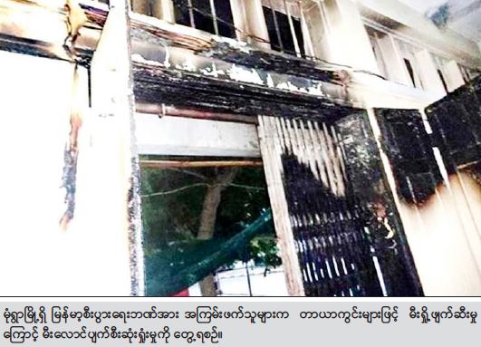 အလားတူ ည ၇ နာရီ ၄၅ မိနစ်အချိန်တွင် စစ်ကိုင်းတိုင်းဒေသကြီး၊ စစ်ကိုင်းမြို့၊ ပိုးတန်း ရပ်ကွက်ရှိ “မြန်မာ့စီးပွားရေး”ဘဏ်အား အကြမ်းဖက်သူ အမျိုးသား ၂ ဦး (စိစစ်ဆဲ) စီးနင်းလာ သည့် ဆိုင်ကယ် ၁ စီးမှ မီးပုလင်းဖြင့် ပစ်ပေါက်ခဲ့မှုကြောင့် ပန်းချုံအနီး ကျရောက်ပေါက်ကွဲခဲ့ပြီး ပေါက်ကွဲမှုကြောင့် လူနှင့် အဆောက်အဦ ထိခိုက်ပျက်စီးမှုမရှိကြောင်း သိရသည်။ အလားတူ မေလ ၇ ရက်နေ့ နံနက် ၂ နာရီ ၁၅ မိနစ်အချိန်တွင် စစ်ကိုင်းတိုင်းဒေသကြီး၊ မုံရွာမြို့၊ မုံရွာတောင်ရပ်ကွက်ရှိ မြန်မာ့စီးပွားရေးဘဏ်အား အကြမ်းဖက်သူလူအုပ်စု(စိစစ်ဆဲ)က တာယာကွင်းများအား အသုံးပြု၍ မီးရှို့ဖျက်ဆီးခဲ့၍ ဘဏ်၏အနောက်ဝင်ပေါက် သစ်သားတံခါး ၂ ချပ်နှင့် ဝါယာကြိုး အနည်းငယ် မီးလောင်ပျက်စီးဆုံးရှုံးခဲ့ကြောင်း သိရသည်။