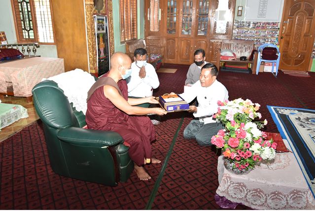 ထို့သို့ လျှောက်ထားရာတွင် မေ ၁၀ ရက်တွင်ကျင်းပခဲ့သည့် နိုင်ငံတော်စီမံအုပ်ချုပ်ရေးကောင်စီ အစည်းအဝေး(၁၀/၂၀၂၁)၌ နိုင်ငံတော်စီမံအုပ်ချုပ်ရေးကောင်စီ ဥက္ကဋ္ဌက ဘုန်းတော်ကြီး သင်ပညာရေး ကျောင်းများသည် မြန်မာ့ပညာရေးစနစ်အတွက် ခေတ်အဆက်ဆက်များစွာ အထောက်အကူပြုခဲ့ကြောင်းနှင့်၊ ဘုန်းတော်ကြီးသင်ပညာရေးကျောင်းများ အဆင်ပြေစွာ ပညာသင်ကြား နိုင်ရေးအတွက် လိုအပ်သည်များကို ပံ့ပိုးဆောင်ရွက်သွားမည်ဖြစ်ကြောင်းကို ထည့်သွင်းပြောကြားခဲ့ကြောင်း၊ ဘုန်းတော်ကြီးသင် ပညာရေးကျောင်းများ အသစ်လျှောက်ထား ခြင်းနှင့် အဆင့်တိုးမြှင့်လျှောက်ထားခြင်းတို့ကို စိစစ်ဆောင်ရွက် ပေးလျက်ရှိကြောင်း၊ ဘုန်းတော်ကြီးသင်ပညာရေးကျောင်းများ အရည်အသွေးမြင့်မားစေရေးနှင့် ဆရာ/ ဆရာမများ အရည်အချင်းပြည့်မီစေရေးတို့ကို အလေးထားဆောင်ရွက်ပေးလျက်ရှိကြောင်း၊ အလယ်တန်းအဆင့်မှ အထက်တန်းအဆင့်သို့ကူးရာတွင်လည်း ပိုင်ပိုင်နိုင်နိုင်အရည်အချင်းရှိရှိ ကူးနိုင်အောင် သင်ကြားပေးရန် လိုအပ်ပါကြောင်း၊ ဘုန်းတော်ကြီးသင်ပညာရေး ကျောင်းများ ဖွင့်လှစ်သည့်အချိန်တွင် ကျောင်းသားများ အခက်အခဲမရှိစေရေး၊ ဘုန်းတော်ကြီးသင် ပညာရေးကျောင်းများမှ ကျောင်းသားများ အခြေခံပညာကျောင်းများသို့ ကျောင်းပြောင်းသည့်အခါ အာမခံချက်ရရှိရေးတို့ကို ဖြည့်ဆည်းဆောင်ရွက် ပေးလျက်ရှိကြောင်း၊ ကျောင်းသားများ အတန်းပညာကို သင်ယူကြသည့်နည်းတူ ဗုဒ္ဓဘာသာကို အခြေခံသော ယဉ်ကျေးမှု သင်တန်းများကိုပါ တက်ရောက်သင်ကြားနိုင်ရေး ဆောင်ရွက်ပေးလျက် ရှိပါကြောင်းနှင့် အခြေခံပညာကျောင်းများဖွင့်လှစ်သည့်အချိန်တွင် ဘုန်းတော်ကြီး သင်ပညာရေး ကျောင်းများ ကိုဗစ်-၁၉ ရောဂါ ကာကွယ်တားဆီးရေး လမ်းညွှန်ချက်များနှင့်အညီ ဖွင့်လှစ်နိုင်ရေး ကြိုတင်ပြင်ဆင်မှုများ ဆောင်ရွက်ထားနိုင်ပါရန် လျှောက်ထားပြီး ကျောင်းအုပ်ဆရာတော် များနှင့် သီလရှင်ဆရာကြီးများ၏ ဩဝါဒကိုနာယူကာ သင်္ကန်း၊ လှူဖွယ်ဝတ္ထုများနှင့် သီလရှင်ဝတ်စုံများ လှူဒါန်းသည်။