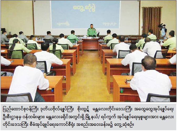 မန္တလေးတိုင်းဒေသကြီး မန္တလေးမြို့သို့ ရောက်ရှိနေ သည့် နိုင်ငံတော်စီမံအုပ်ချုပ်ရေး ကောင်စီအဖွဲ့ဝင် ပြည်ထဲရေးဝန်ကြီးဌာန ပြည်ထောင်စုဝန်ကြီး ဒုတိယဗိုလ်ချုပ်ကြီး စိုးထွဋ် သည် ယနေ့မွန်းလွဲ ပိုင်းတွင် မန္တလေးတိုင်းဒေသကြီး အထွေထွေအုပ်ချုပ် ရေးဦးစီးဌာနမှ ဝန်ထမ်းများ၊ မန္တလေးခရိုင်အတွင်း ရှိ မြို့နယ်/ ရပ်ကွက် အုပ်ချုပ်ရေးမှူးများအား မန္တလေးတိုင်းဒေသကြီး စီမံအုပ်ချုပ်ရေးကောင်စီရုံး အစည်းအဝေးခန်းမ၌ တွေ့ဆုံသည်။