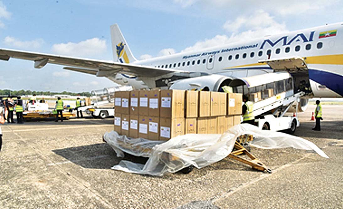 အိန္ဒိယနိုင်ငံ၌ ကိုဗစ် − ၁၉ ရောဂါဖြစ်ပွားမှုမြင့်တက်နေသည့်ကာလအတွင်း ရောဂါကာကွယ်၊ ထိန်းချုပ်၊ ကုသရေးလုပ်ငန်းများတွင် အသုံးပြုနိုင်ရန်နှင့် အိန္ဒိယနိုင်ငံ ဆိုင်ရာ မြန်မာနိုင်ငံသံရုံးရှိ ဝန်ထမ်းများအတွက် နိုင်ငံတော်စီမံအုပ်ချုပ်ရေးကောင်စီက လှူဒါန်းသည့် ကိုဗစ် − ၁၉ ရောဂါ ကာကွယ်၊ ထိန်းချုပ်၊ ကုသရေး အထောက်အကူပြု ဆေးပစ္စည်းများကို ယနေ့နံနက်ပိုင်းတွင် အပြည်ပြည်ဆိုင်ရာ မြန်မာလေကြောင်းလိုင်းမှ အထူးလေယာဉ် နှစ်စင်းတို့ဖြင့် နေပြည်တော် လေဆိပ်နှင့် ရန်ကုန်အပြည်ပြည်ဆိုင်ရာ လေဆိပ်တို့မှ သွားရောက်ပို့ဆောင်လှူဒါန်းသည်။
