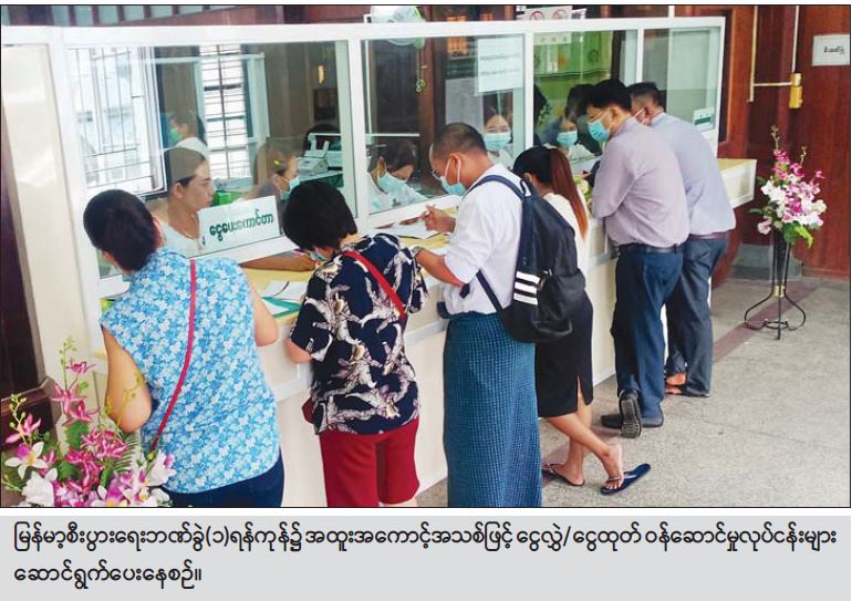 ရန်ကုန်တိုင်းဒေသကြီးအတွင်း မြန်မာ့စီးပွားရေးဘဏ်ခွဲ(၁)အပါအဝင် တိုင်းဒေသကြီး အတွင်းရှိ စုစုပေါင်းဘဏ်ခွဲ ၁၇ ခု တွင် ယနေ့ စတင်ဖွင့်လှစ်သော အထူးအကောင့်အသစ်ဖြင့် ငွေကြေး ဝန်ဆောင်မှုလုပ်ငန်းများကို စတင်လုပ်ဆောင်ရာတွင် အကောင့်အသစ်ဖြင့်ငွေသားအပ်နှံမှုနှင့် ငွေလွှဲမှုမှာ ငွေကျပ်သိန်း ပေါင်း ၅၀၀ ကျော်ရှိခဲ့ပြီး အခြားမြို့နယ်အသီးသီးရှိ ချိတ်ဆက် ထားသော သက်ဆိုင်ရာဘဏ် အသီးသီးမှ လွှဲပြောင်းလိုက်သော ငွေများကို ထုတ်ပေးရာတွင် ငွေကျပ်သန်းပေါင်း ၁၈၆ သန်း ဝန်းကျင်ရှိကြောင်း သိရသည်။