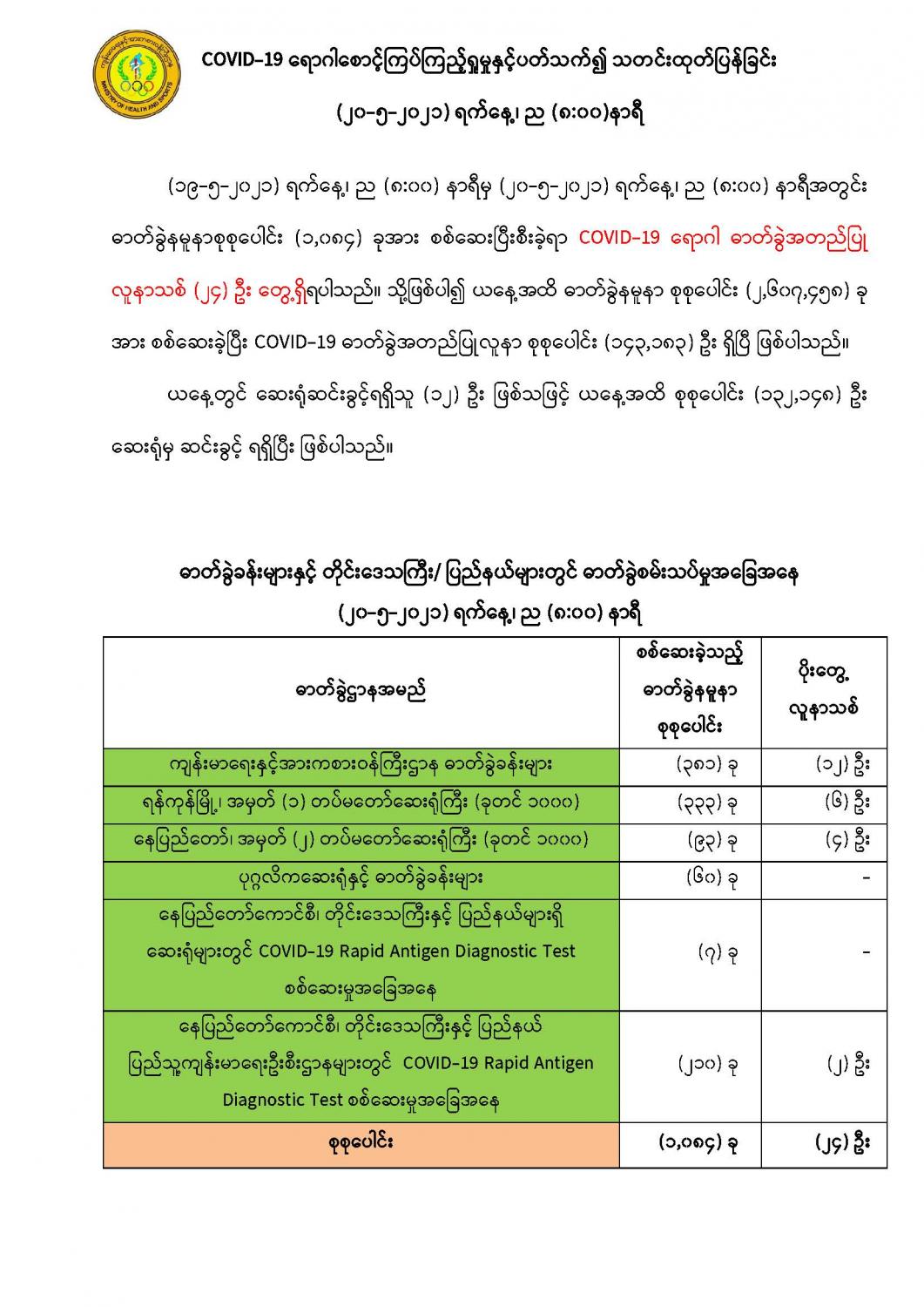 COVID-19 ရောဂါစောင့်ကြပ်ကြည့်ရှုမှုနှင့်ပတ်သက်၍ သတင်းထုတ်ပြန်ခြင်း (၂၀-၅-၂၀၂၁) ရက်နေ့၊ ည (၈:၀၀)နာရီ