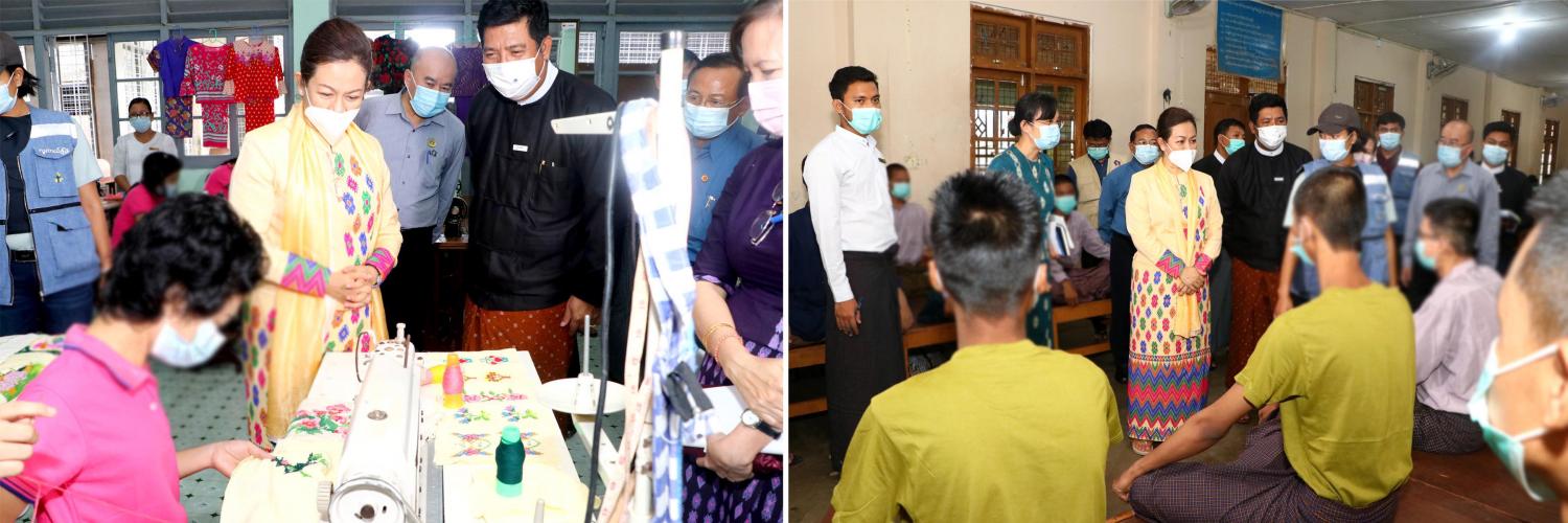 ဆက်လက်၍ ဗဟန်းမြို့နယ်၊ နတ်မောက်လမ်းရှိ အမျိုးသမီးသက်မွေး အတတ်ပညာ သင်ကျောင်း VTW (ရန်ကုန်)နှင့် ကမာရွတ်မြို့နယ်၊ သံလွင်လမ်းရှိ အမျိုးသမီးများ ဖွံ့ဖြိုးတိုးတက်ရေးဌာနများသို့ ရောက်ရှိခဲ့ကြပြီး အသက်မွေးဝမ်းကျောင်း ပညာရပ်များဖြစ် သည့် စက်ချုပ်သင်တန်း၊ ဇာထိုးပန်းထိုးသင်တန်း၊ ယက္ကန်းသင်တန်း၊ အလှအပပြုပြင် ပေးမှုဆိုင်ရာ ဝန်ဆောင်မှုသင်တန်း၊ ဆေးဝါးကျွမ်းကျင်သင်တန်း၊ သူနာပြုအကူသင်တန်း စသည်တို့ကို လေ့ကျင့်သင်ကြားပေးနေမှုများ၊ သင်တန်းသူများကိုယ်တိုင် ပြုလုပ်ထားသည့် အိမ်တွင်းမှု ပစ္စည်းများ ကို ရောင်းချမည့် အရောင်းဆိုင်ပြန်လည်ဖွင့်လှစ်နိုင်ရေး ပြင်ဆင် ဆောင်ရွက်ထားရှိမှုများ၊ အမျိုးသမီး သက်မွေးအတတ်ပညာသင်ကျောင်း (ရန်ကုန်)တွင် အကြမ်းဖက်ခံရသူ အမျိုးသမီးများကို တစ်နေရာတည်းတွင် ဝန်ဆောင်မှုပေးသည့် စင်တာ (One Stop Women Support Center- OSWSC)ကို ဖွင့်လှစ်ထားရှိပြီး အကြမ်းဖက်ခံရသူ အမျိုးသမီးများအား လက်ခံစောင့်ရှောက်ကာ ကျန်းမာရေးဆိုင်ရာများ၊ တရားရင်ဆိုင်ရန်နှင့် စိတ်လူမှုပိုင်းဆိုင်ရာပံ့ပိုးပေးခြင်းလုပ်ငန်းများ ဆောင်ရွက်ထားရှိမှုများကို လှည့်လည်ကြည့်ရှု ကာ ပြည်ထောင်စု ဝန်ကြီးနှင့် တာဝန်ရှိသူများက သိရှိလိုသည်များကို မေးမြန်းခဲ့ကြပြီး လိုအပ်ချက်များကို မှာကြားခဲ့ကြသည်။
