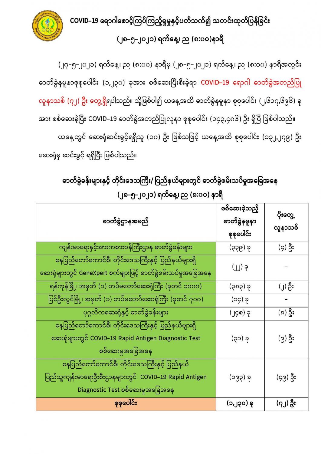COVID-19 ရောဂါစောင့်ကြပ်ကြည့်ရှုမှုနှင့်ပတ်သက်၍ သတင်းထုတ်ပြန်ခြင်း (၂၈-၅-၂၀၂၁) ရက်နေ့၊ ည (၈:၀၀)နာရီ