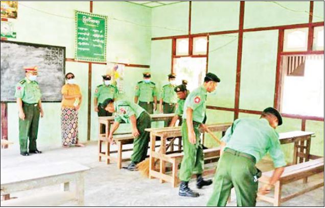 ၂၀၂၁-၂၀၂၂ ပညာသင်နှစ် ကျောင်းဖွင့် ရာသီတွင် ကျောင်းသား ကျောင်းသူများ အဆင်ပြေ ချောမွေ့စွာ ပညာသင်ကြား နိုင်ရေးနှင့် ကျောင်းပတ်ဝန်းကျင်သန့်ရှင်း သာယာလှပရေးအတွက် ပြည်နယ်နှင့် တိုင်းဒေသကြီးအသီးသီးရှိ အခြေခံပညာကျောင်းများ၌ တိုင်းစစ်ဌာနချုပ်များ အလိုက် နယ်မြေခံတပ်မတော်သားများနှင့် မိသားစုများ၊ မြန်မာနိုင်ငံရဲတပ်ဖွဲ့ဝင်များ၊ မီးသတ်တပ်ဖွဲ့ဝင်များ၊ ပြည်သူ့စစ်(ဌာနေ) အဖွဲ့ဝင်များနှင့် ဌာနဆိုင်ရာ ဝန်ထမ်းများက ကျောင်းသန့်ရှင်းရေးလုပ်ငန်းများ စုပေါင်းဆောင်ရွက်ပေးလျက်ရှိသည်။