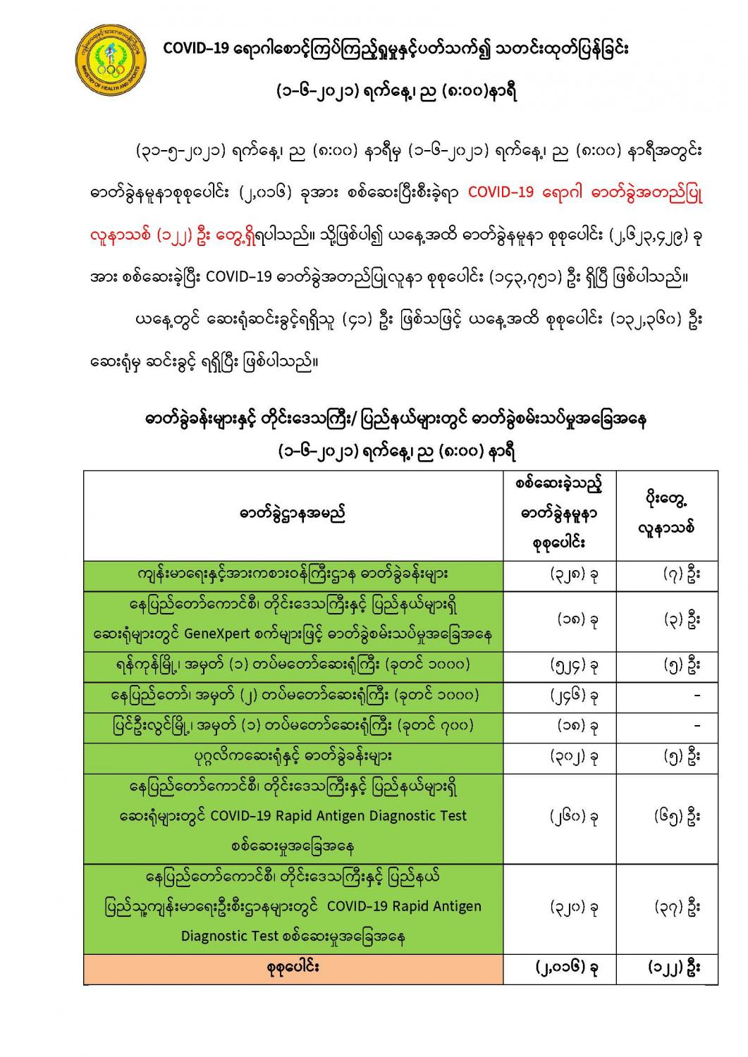 COVID-19 ရောဂါစောင့်ကြပ်ကြည့်ရှုမှုနှင့်ပတ်သက်၍ သတင်းထုတ်ပြန်ခြင်း (၁-၆-၂၀၂၁) ရက်နေ့၊ ည (၈:၀၀)နာရီ