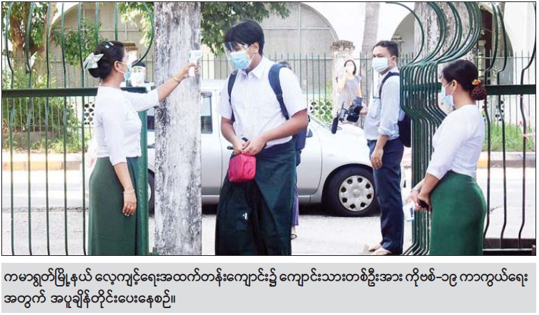 ကိုဗစ်-၁၉ ကူးစက်ကပ်ရောဂါကြောင့် မြန်မာနိုင်ငံရှိ အခြေခံပညာ ကျောင်းများကို ၂၀၂၀-၂၀၂၁ ပညာသင်နှစ်တွင် ပညာသင်ကြားမှုများ ရပ်နားခဲ့ရာမှ ၂၀၂၁-၂၀၂၂ ပညာသင်နှစ်အတွက် အခြေခံပညာအဆင့် ကျောင်းများကို နိုင်ငံတော်က ယနေ့ ပြန်လည်ဖွင့်လှစ်ခဲ့ရာ ကျောင်းသားကျောင်းသူများ စတင်ပညာသင်ကြားလျက်ရှိသည်။
