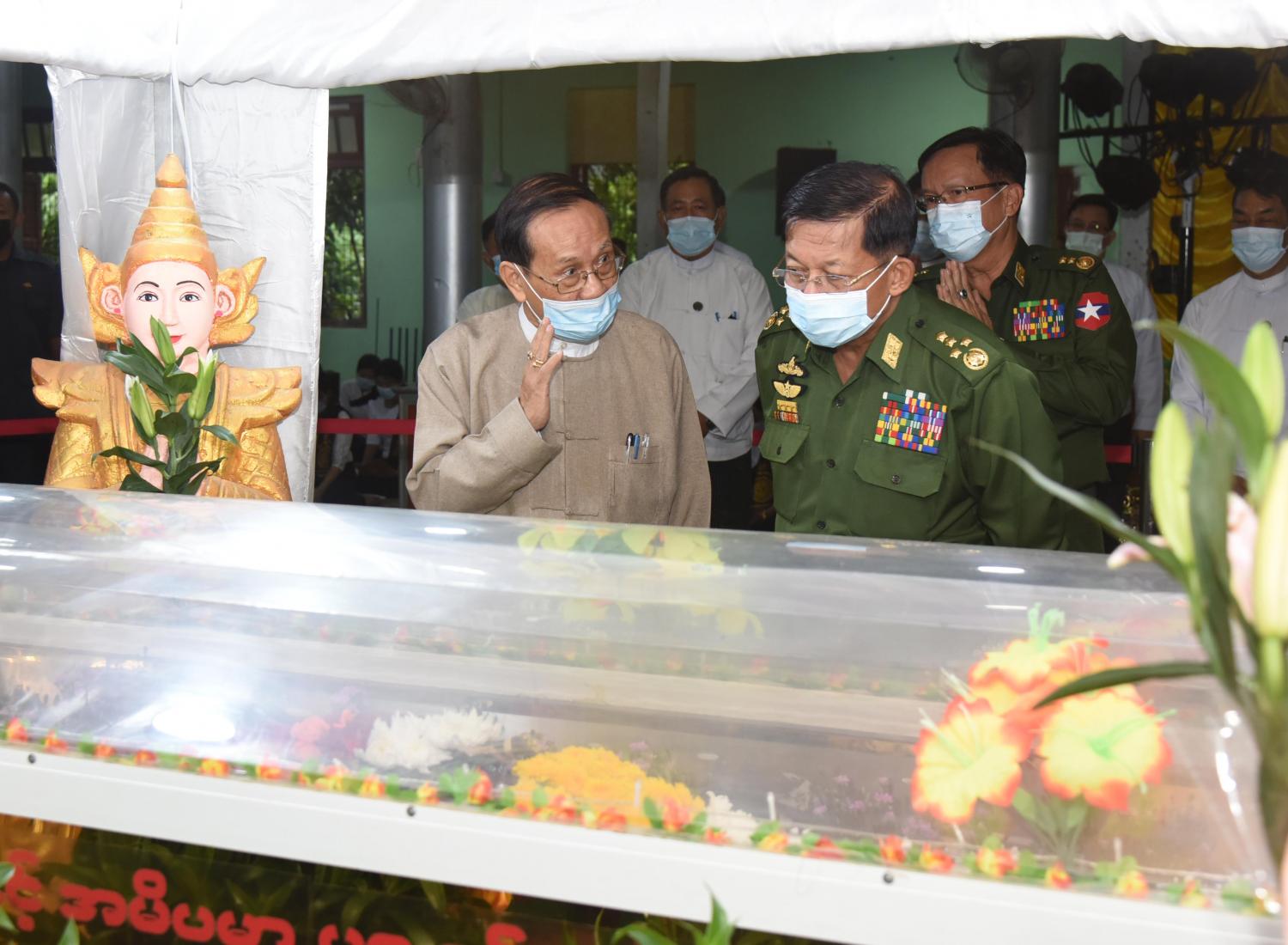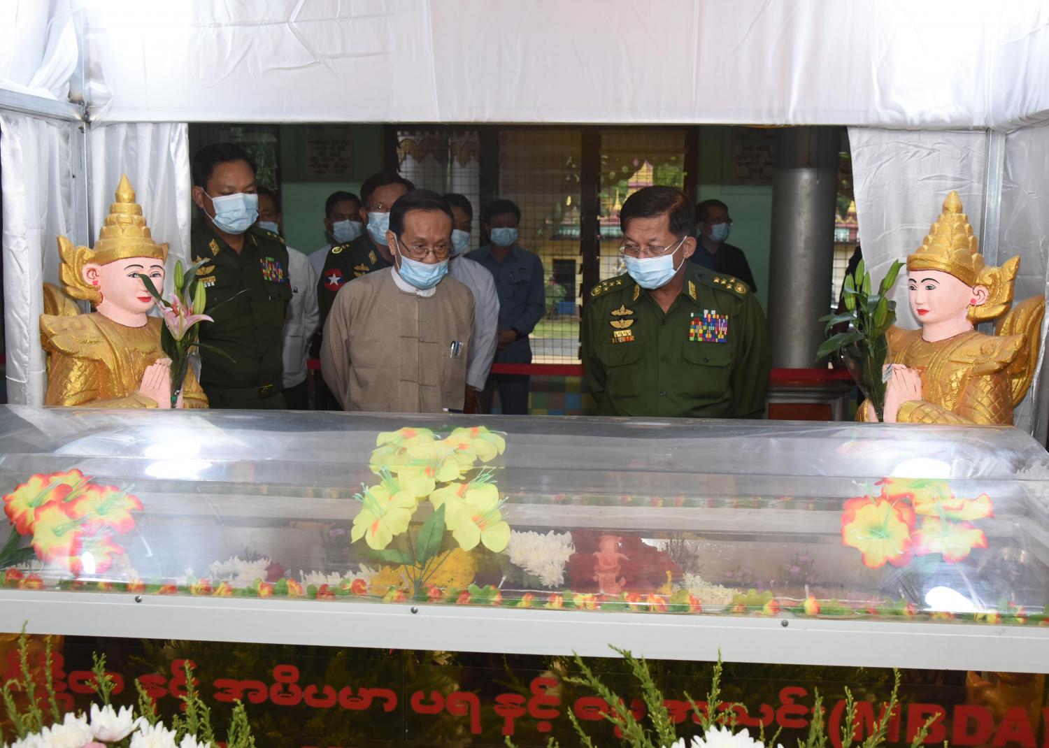 ဦးစွာ နိုင်ငံတော်စီမံအုပ်ချုပ်ရေးကောင်စီဥက္ကဋ္ဌ တပ်မတော်ကာကွယ်ရေးဦးစီးချုပ် ဗိုလ်ချုပ်မှူးကြီး မင်းအောင်လှိုင် သည် ဈေကုန်းကျောင်းတိုက် ရွှေရတုဗိမာန် စံကျောင်းတော်အတွင်း အပူဇော်ခံထားရှိသည့် ဈေးကုန်းဆရာတော်ဘုရားကြီး၏ ရုပ်ကလာပ်တော်အား ဂါရဝပြုဖူးမြော်သည်။