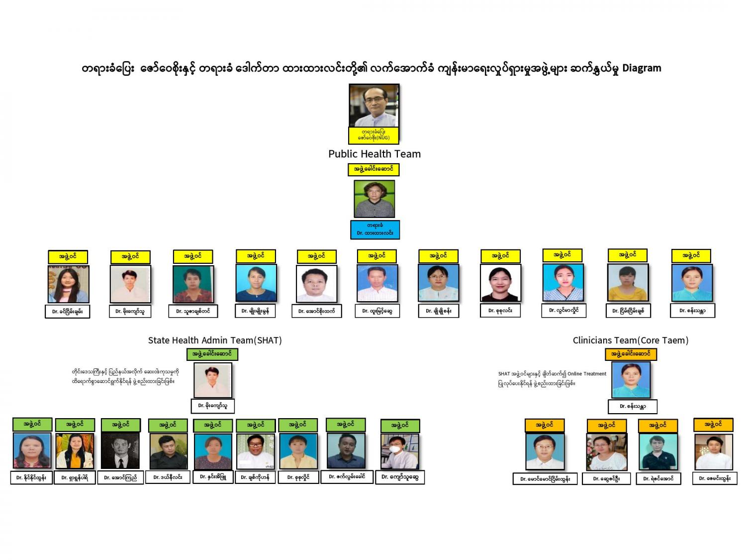 ဒေါက်တာ ထားထားလင်း ဦးဆောင်သော Public Health Team ၏ အောက်တွင် ပြည်နယ်နှင့် တိုင်းဒေသကြီးအဆင့် State Health Admin Team (SHAT)ကို အဖွဲ့ခေါင်းဆောင် ဒေါက်တာ မိုးကျော်သူ(ယခင်ဘီးလင်းမြို့နယ် ကျန်းမာရေးမှူး) အပါအဝင် ၁၀ ဦးဖြင့် အောက်ပါအတိုင်း ဖွဲ့စည်းထားကြောင်း သိရှိရပါသည်-