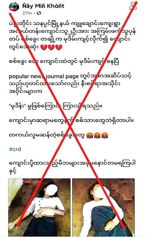 မေး(၁) ။ ။ ပဲခူးတိုင်းဒေသကြီး၊ သနပ်ပင်မြို့နယ်၊ ကျူးချောင်းကျေးရွာ အလယ်တန်းကျောင်းသူ ၂ ဦးကို တပ်မတော်သားအချို့က မုဒိမ်းကျင့်လို့ ကျောင်းမှာသေဆုံးသွားတယ်လို့ Social Media Facebook စာမျက်နှာပေါ်မှာ ပျံ့နှံ့နေတာ တွေ့ရပါတယ်။ အဲဒီသတင်းနဲ့ပတ်သက်ပြီး အခြေအနေမှန်ကို သိလိုပါတယ်။