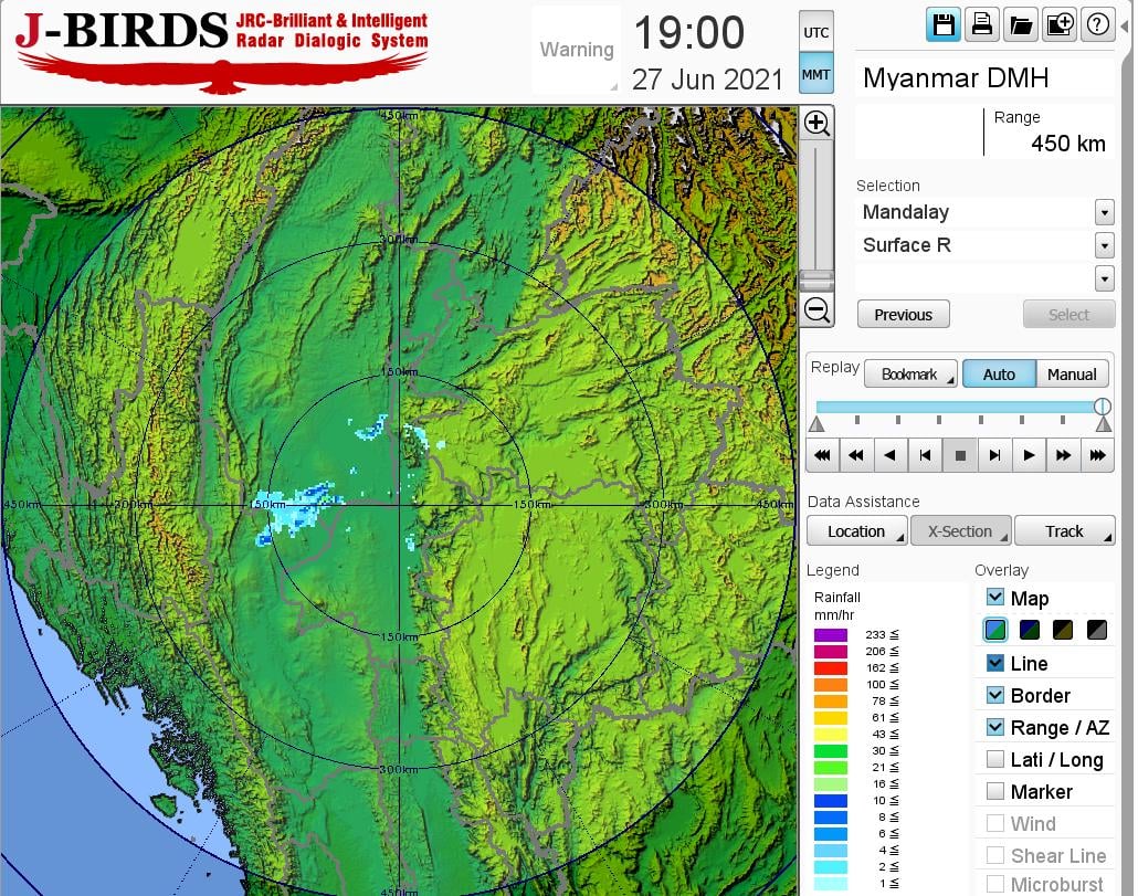 မနက်ဖြန်မွန်းတည့်ချိန်အထိခန့်မှန်းချက်။ နေပြည်တော်၊ စစ်ကိုင်းတိုင်းဒေသကြီးအောက်ပိုင်း၊ မန္တလေးတိုင်းဒေသကြီးနှင့် မကွေးတိုင်းဒေသကြီးတို့တွင် နေရာကွက်ကျား၊ တနင်္သာရီတိုင်းဒေသကြီး၊ ရှမ်းပြည်နယ်(တောင်ပိုင်း နှင့် အရှေ့ပိုင်း)၊ ရခိုင်ပြည်နယ်နှင့် ကယားပြည်နယ်တို့တွင် နေရာကျဲကျဲ၊ စစ်ကိုင်းတိုင်းဒေသကြီးအထက်ပိုင်း၊ ပဲခူးတိုင်းဒေသကြီး၊ ဧရာဝတီတိုင်းဒေသကြီး၊ ကချင်ပြည်နယ်၊ ရှမ်းပြည်နယ်(မြောက်ပိုင်း)၊ ချင်းပြည်နယ်နှင့် ကရင်ပြည်နယ်တို့တွင် နေရာစိပ်စိပ်နှင့် ကျန်တိုင်းဒေသကြီးနှင့် ပြည်နယ်တို့တွင် နေရာအနှံ့အပြား မိုးထစ်ချုန်းရွာမည်။ ရွာရန်ရာနှုန်းပြည့် ဖြစ်ပါသည်။