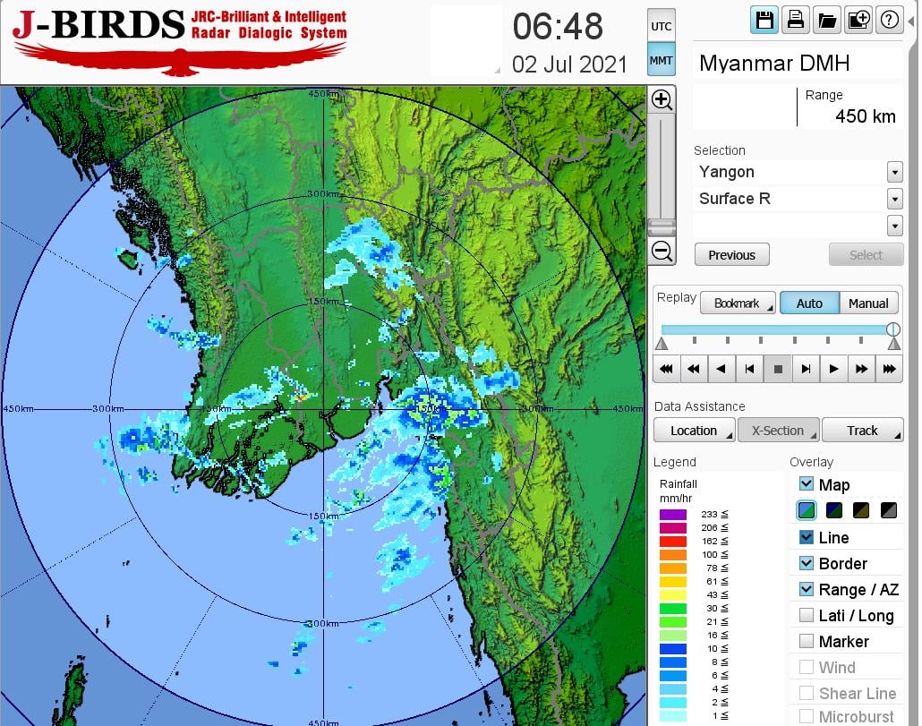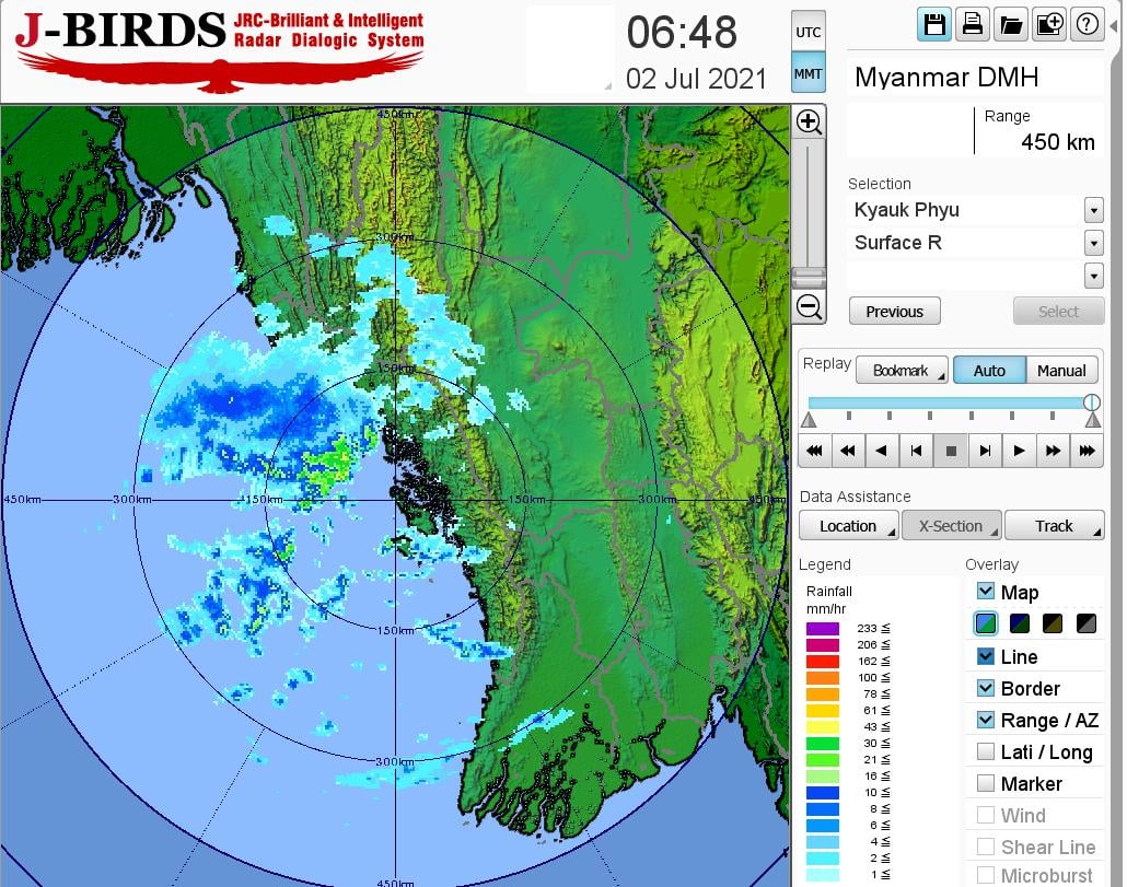 ယနေ့ညနေအထိခန့်မှန်းချက်။စစ်ကိုင်းတိုင်းဒေသကြီးအောက်ပိုင်း၊ မကွေးတိုင်းဒေသကြီးနှင့် ရှမ်းပြည်နယ်(မြောက်ပိုင်း)တို့တွင် နေရာကျဲကျဲ၊ စစ်ကိုင်းတိုင်းဒေသကြီးအထက်ပိုင်း၊ မန္တလေးတိုင်းဒေသကြီးနှင့် ကချင်ပြည်နယ်တို့တွင် နေရာစိပ်စိပ်နှင့် ကျန်တိုင်းဒေသကြီးနှင့် ပြည်နယ်တို့တွင် နေရာအနှံ့အပြား မိုးထစ်ချုန်းရွာပြီး၊ ရခိုင်ပြည်နယ်တွင် ဒေသအလိုက်နှင့် စစ်ကိုင်းတိုင်းဒေသကြီးအထက်ပိုင်း၊ ကချင်ပြည်နယ်၊ ကရင်ပြည်နယ်နှင့် မွန် နယ်ပြည်တို့တွင် နေရာကွက်၍ မိုးကြီးနိုင်ပါသည်။ ရွာရန်ရာနှုန်းပြည့် ဖြစ်ပါသည်။