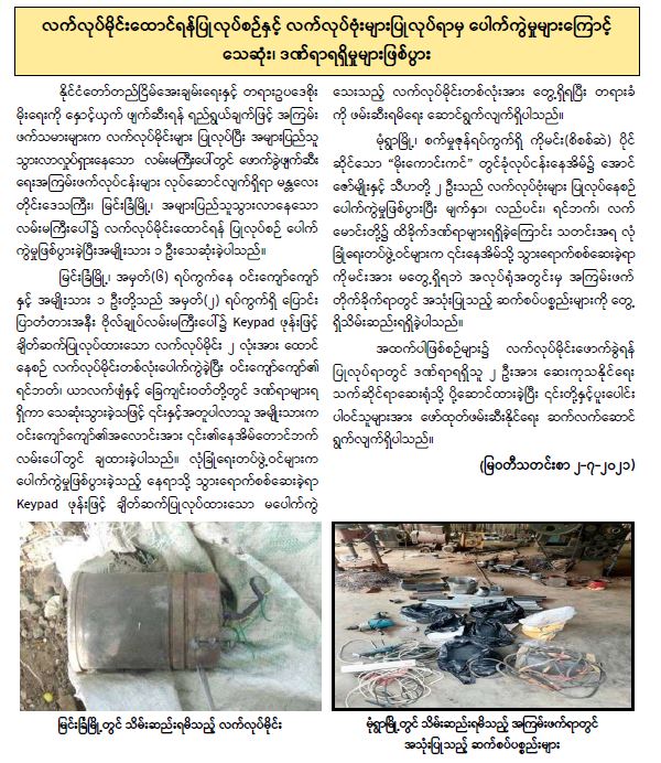 လက်လုပ်မိုင်းထောင်ရန်ပြုလုပ်စဉ်နှင့် လက်လုပ်ဗုံးများပြုလုပ်ရာမှ ပေါက်ကွဲမှုများကြောင့် သေဆုံး၊ ဒဏ်ရာရရှိမှုများဖြစ်ပွား 07/05/2021