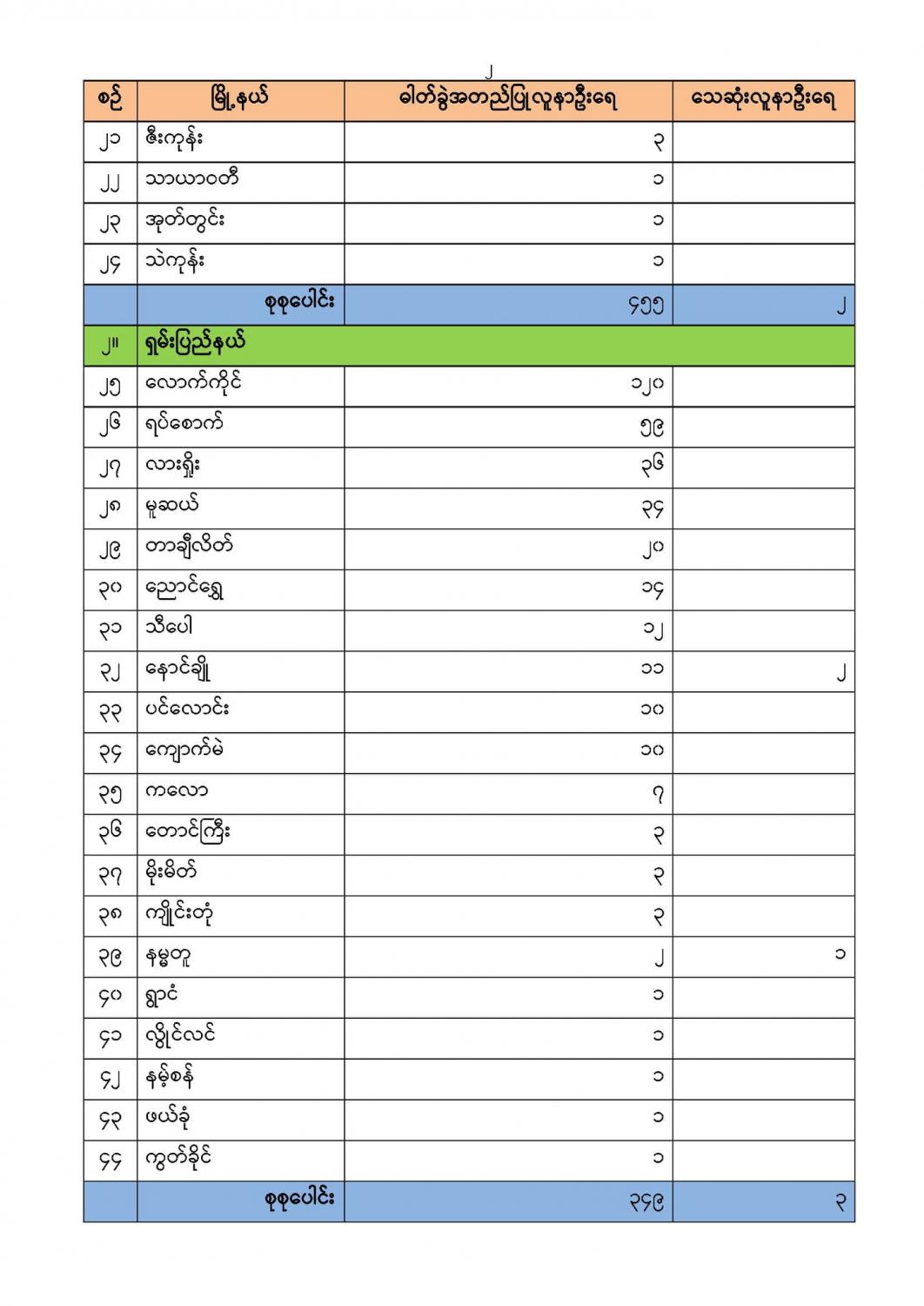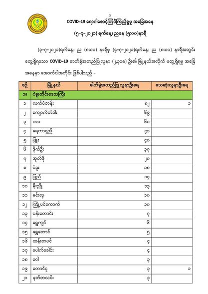 (၃-၇-၂၀၂၁)ရက်နေ့၊ ည (၈:၀၀) နာရီမှ (၄-၇-၂၀၂၁)ရက်နေ့၊ ည (၈:၀၀) နာရီအတွင်း တွေ့ရှိရသော COVID-19 ဓာတ်ခွဲအတည်ပြုလူနာ (၂,၃၁၈) ဦး၏ မြို့နယ်အလိုက် တွေ့ရှိရမှု အခြေ အနေမှာ အောက်ပါအတိုင်း ဖြစ်ပါသည် -