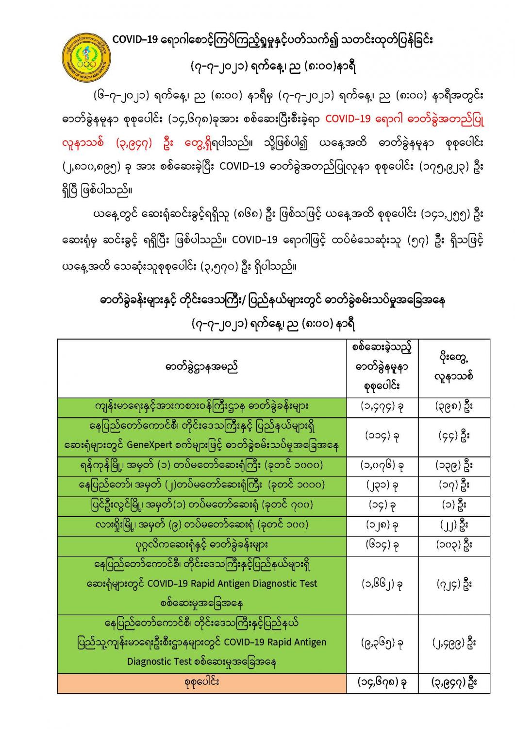 COVID-19 ရောဂါစောင့်ကြပ်ကြည့်ရှုမှုနှင့်ပတ်သက်၍ သတင်းထုတ်ပြန်ခြင်း (၇-၇-၂၀၂၁) ရက်နေ့၊ ည (၈:၀၀)နာရီ 07/07/2021 COVID-19 ရောဂါစောင့်ကြပ်ကြည့်ရှုမှုနှင့်ပတ်သက်၍ သတင်းထုတ်ပြန်ခြင်း (၇-၇-၂၀၂၁) ရက်နေ့၊ ည (၈:၀၀)နာရီ
