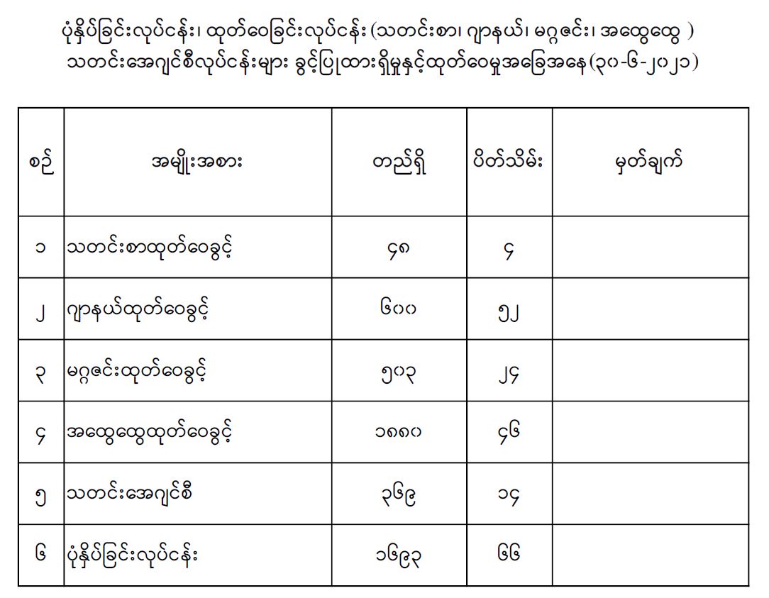 ပုံနှိပ်ခြင်းလုပ်ငန်း ထုတ်ဝေခြင်းလုပ်ငန်း (သတင်းစာ၊ ဂျာနယ်၊ မဂ္ဂဇင်း၊ အထွေထွေ) သတင်းအေဂျင်စီလုပ်ငန်းများခွင့်ပြုထားရှိမှုနှင့် ထုတ်ဝေမှုအခြေအနေ (၃၀-၆-၂၀၂၁)) 07/09/2021