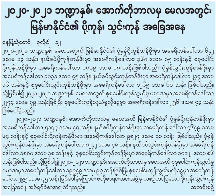 ၂၀၂၀-၂၀၂၁ ဘဏ္ဍာနှစ်၊ အောက်တိုဘာလမှ မေလအတွင်း မြန်မာနိုင်ငံ၏ ပို့ကုန်၊ သွင်းကုန် အခြေအနေ