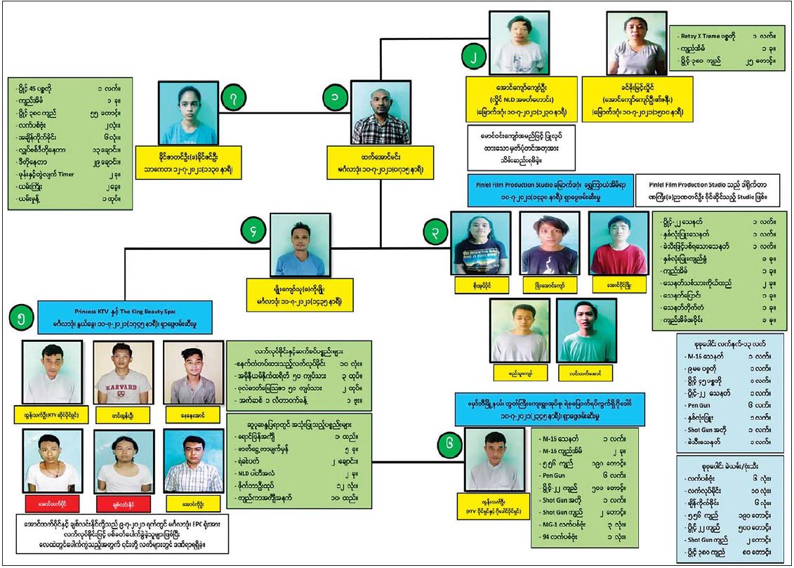 အဆိုပါဖြစ်စဉ်တစ်ခုလုံးတွင် M-16 သေနတ် ၁ လက်၊ ၉ မမ ပစ္စတို ၁ လက်၊ ပွိုင့် ၂၂ ၁ လက်၊ ပွိုင့် 45 ပစ္စတို ၁ လက်၊ Pen Gun ၆ လက်၊ နှစ်လုံးပြူး ၁ လက်၊ Shot Gun ၁ လက်၊ ခဲသီးသေနတ် ၁ လက် စုစုပေါင်း လက်နက် ၁၃ လက်၊ တရားခံ ၁၆ ဦး၊ ခဲယမ်း၊ လက်ပစ်ဗုံး၊ လက်လုပ်မိုင်းနှင့် ဆက်စပ်ပစ္စည်းများ ဖမ်းဆီးရမိခဲ့ပါသည်။