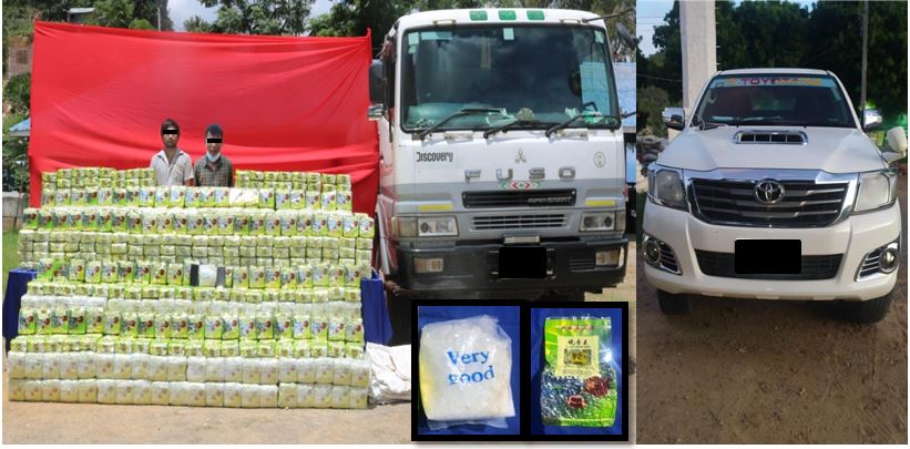 ရှမ်းပြည်နယ်(တောင်ပိုင်း)၊ နမ့်စန်မြို့နယ်မှ မန္တလေးမြို့သို့ သယ်ဆောင်မည့် ငွေကျပ် ၃၂ ဘီလီယံ တန်ဖိုးရှိ အိုက်စ်(မက်သ်အဖက်တမင်း) အလေးချိန် ၁,၆၀၀ ကီလိုဖမ်းဆီးရမိ