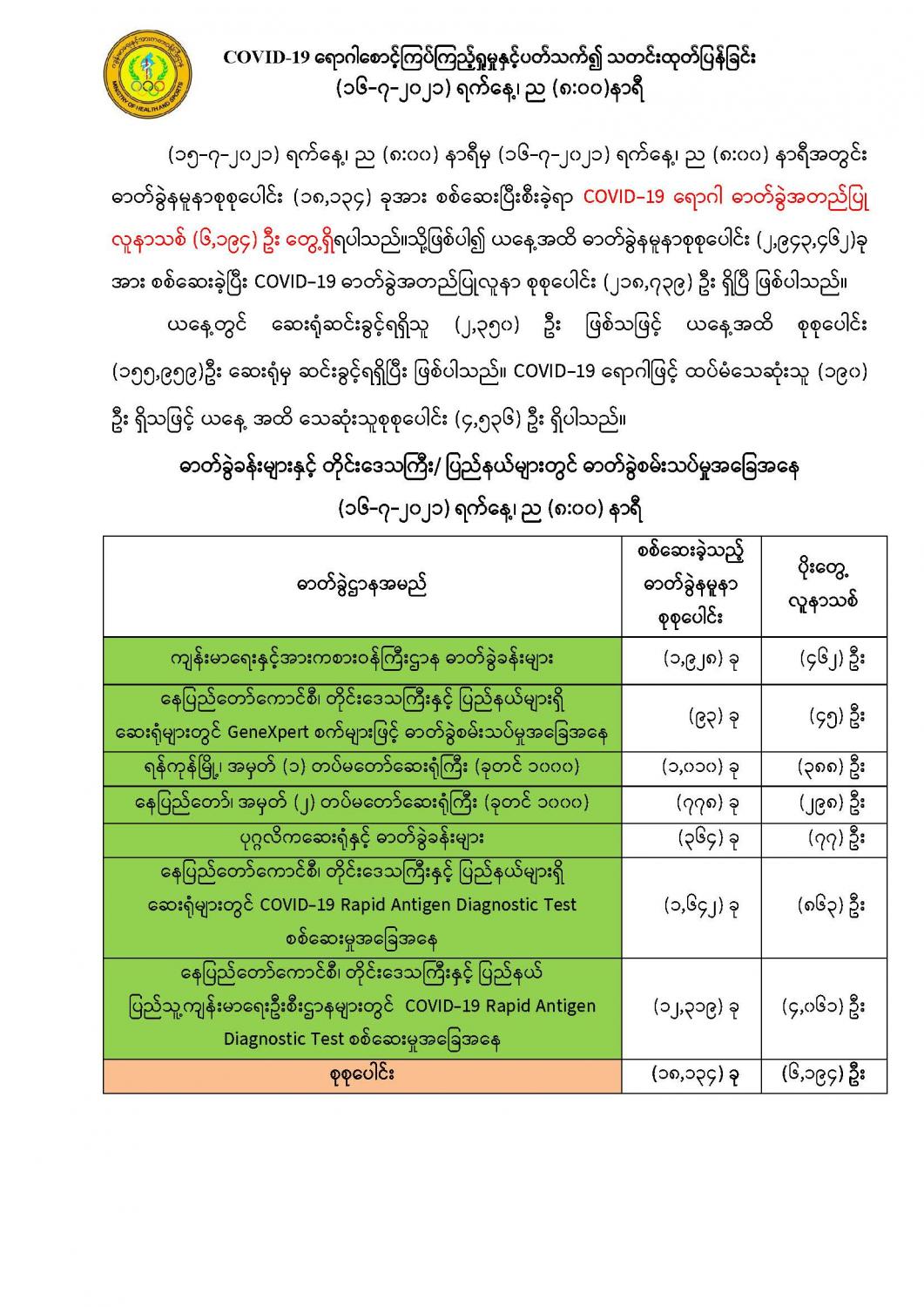 COVID-19 ရောဂါစောင့်ကြပ်ကြည့်ရှုမှုနှင့်ပတ်သက်၍ သတင်းထုတ်ပြန်ခြင်း (၁၆-၇-၂၀၂၁) ရက်နေ့၊ ည (၈:၀၀)နာရီ 07/16/2021