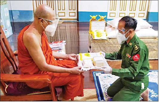 ထိုသို့ ဆောင်ရွက်လျက်ရှိရာ ယနေ့တွင် မွန်ပြည်နယ်၊ မော်လမြိုင်မြို့၊ ဝဲပျံ ကျောင်းတိုက်နှင့် ရွှေနတ်တောင်ကျောင်းတိုက်၊ မန္တလေးတိုင်းဒေသကြီး၊ မန္တလေးမြို့၊ ချမ်းမြသာစည်မြို့နယ်ရှိ ဒက္ခိဏရာမဘုရားကြီးကျောင်းတိုက်၊ အတုလကာရီဆင်မင်း ကျောင်းတိုက်နှင့် တောင်ပြင်ထီးလင်းကျောင်းတိုက်တို့ရှိ သံဃာတော်များနှင့် သာသနာနွယ်ဝင် သီလရှင်များအား ဆွမ်း ဆန်တော်၊ ဆီ၊ ဆား၊ ပဲ အမယ်(၄)မျိုး၊ ကိုဗစ် - ၁၉ ရောဂါ ကာကွယ်ရေးအထောက် အကူပြုပစ္စည်းများနှင့် လှူဖွယ်ပစ္စည်းများကို သက်ဆိုင်ရာ သက်ဆိုင်ရာတိုင်းစစ်ဌာနချုပ်အသီးသီးမှ တာဝန်ရှိသူများက သွားရောက်၍ ဆက်ကပ်လှူဒါန်းခဲ့ကြကြောင်း သတင်းရရှိသည်။