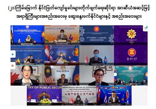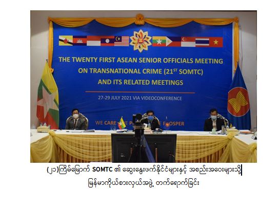 အာဆီယံ၏ နိုင်ငံရေးနှင့် လုံခြုံရေးအသိုက်အဝန်း (APSC) မဏ္ဍိုင်မှ (၂၁)ကြိမ်မြောက် နိုင်ငံဖြတ်ကျော် မှုခင်းတိုက်ဖျက်ရေးဆိုင်ရာ အဆင့်မြင့်အရာရှိကြီးများ အစည်းအဝေး (21st ASEAN Senior Officials Meeting on Transnational Crime - 21st SOMTC) ကို ဘရူနိုင်းဒါရူဆလမ်နိုင်ငံက အိမ်ရှင်အဖြစ် ဦးဆောင်၍ ဇူလိုင် ၂၇ ရက်တွင် Video Conferencing ဖြင့် ကျင်းပသည်။
