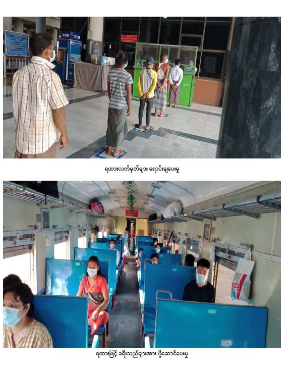 မြန်မာ့မီးရထားအနေဖြင့် ရုံးပိတ်ရက်မတိုင်မီက ခရီးစဉ်အသီးသီးသို့ ပုံမှန် (၃၆)စင်း နေ့စဉ် ပြေးဆွဲခဲ့ရာမှ ဇူလိုင် ၁၉ ရက်မှစတင်၍ ရန်ကုန်-မန္တလေးလမ်းပိုင်းတွင် စာပို့ရထား (၂)စင်း၊ ရန်ကုန်-မော်လမြိုင်လမ်းပိုင်းတွင် အမြန်ရထား (၁)စင်း၊ ရန်ကုန်-ပြည်လမ်းပိုင်းတွင် စာပို့ရထား (၁)စင်း၊ ရန်ကုန်မြို့ပတ်လမ်းပိုင်းတွင် RBE ရထား(၁၂)စင်း၊ စုစုပေါင်း (၁၈)စင်းကို နေ့စဉ် ပြေးဆွဲပေးလျက် ရှိသည်။ ကုန်ရထားပြေးဆွဲမှုအနေဖြင့် ဇူလိုင် ၁၉ ရက်မှစ၍ ယနေ့အထိ ကုန်သေတ္တာရထား (၈)စင်း၊ အထွေထွေကုန်ရထား (၄)စင်း၊ ကျောက်ရထား (၇)စင်း၊ ကွန်ကရစ်ဇလီဖားတင်ရထား (၃)စင်း စုစုပေါင်း (၂၂)စင်း ပြေးဆွဲပေးခဲ့သည်။