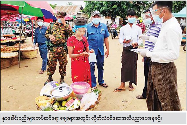 ဆောင်ရွက်လျက်ရှိပါသည်။ ကျန်းမာရေးဝန်ထမ်း များ၊ ဓာတ်ခွဲကျွမ်းကျင် ဝန်ထမ်းများသာမက ကြက်ခြေနီတပ်ဖွဲ့ဝင်များ၊ ပရဟိတအသင်းအဖွဲ့များ ပူးပေါင်းပြီး ကိုယ်အပူချိန် တိုင်းတာခြင်း၊ ကိုဗစ်-၁၉ ရာဂါသံသယလက္ခဏာများ စိစစ်ခြင်း၊ သွေးတွင်း အောက်ဆီဂျင်တိုင်းတာခြင်း၊ လိုအပ်ပါက RDT Test Kit များဖြင့် စစ်ဆေးခြင်းများ မြို့အဝင်ဂိတ်များတွင်ဆောင်ရွက် ပေးလျက်ရှိပြီး ကိုဗစ်-၁၉ သံသယရှိသူများအနေဖြင့် ပေါင်းလောင်းအားကစားကွင်းနှင့် လယ်ဝေး အားကစားကွင်းများတွင် စစ်ဆေးနိုင်ရေး ဆောင် ရွက်ပေးလျက်ရှိပါသည်။