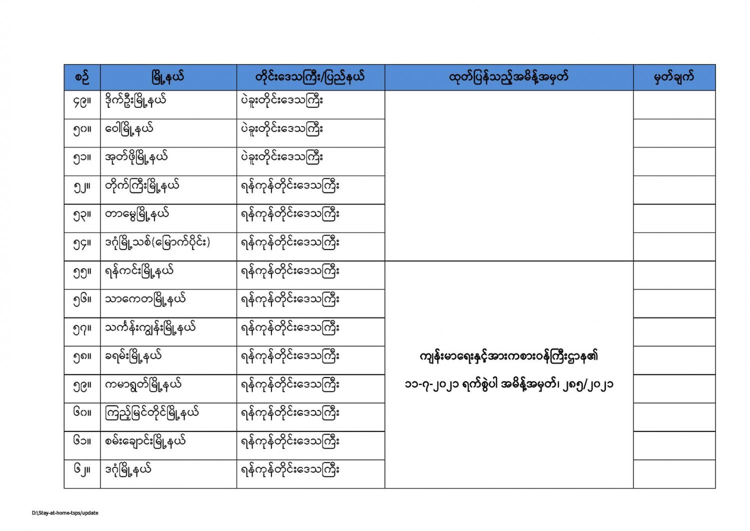 ကျန်းမာရေးနှင့်အားကစားဝန်ကြီးဌာနမှ နေအိမ်တွင်နေထိုင်ရေး(Stay at Home) အစီအစဉ်တွင်အကျုံးဝင်ကြောင်းကြေညာထားသည့် မြို့နယ်များစာရင်း (updated as of 31.7.2021) 07/31/2021