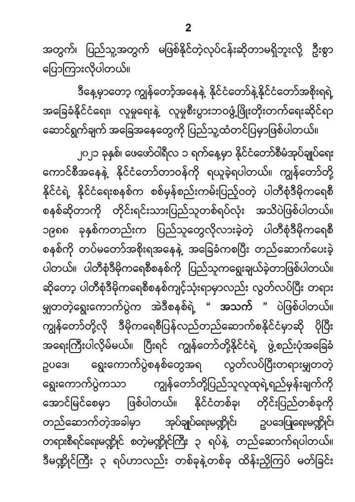 နိုင်ငံတော်စီမံအုပ်ချုပ်ရေးကောင်စီ၏ (၆) လပြည့် နိုင်ငံတော်တာဝန် ထမ်းဆောင်ခဲ့သည့် ၂၀၂၁ ခုနှစ်၊ သြဂုတ်လ ၁ ရက်နေ့တွင် နိုင်ငံတော် စီမံအုပ်ချုပ်ရေးကောင်စီဥက္ကဋ္ဌ ဗိုလ်ချုပ်မှူးကြီး မင်းအောင်လှိုင် ပြောကြားသည့်မိန့်ခွန်း