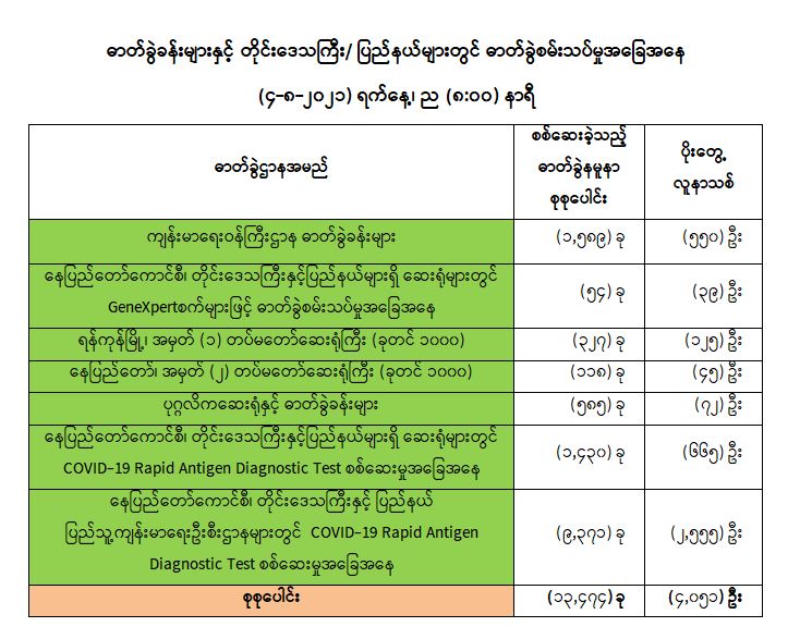 (၃-၈-၂၀၂၁) ရက်နေ့၊ ည (၈:၀၀) နာရီမှ (၄-၈-၂၀၂၁) ရက်နေ့၊ ည (၈:၀၀) နာရီအတွင်း ဓာတ်ခွဲနမူနာစုစုပေါင်း (၁၃,၄၇၄) ခုအား စစ်ဆေးပြီးစီးခဲ့ရာ COVID-19 ရောဂါ ဓာတ်ခွဲအတည်ပြု လူနာသစ် (၄,၀၅၁) ဦးတွေ့ရှိရပါသည်။ သို့ဖြစ်ပါ၍ ယနေ့အထိ ဓာတ်ခွဲနမူနာစုစုပေါင်း (၃,၂၀၉,၅၉၀) ခုအား စစ်ဆေးခဲ့ပြီး COVID-19 ဓာတ်ခွဲအတည်ပြုလူနာ စုစုပေါင်း (၃၁၅,၁၁၈) ဦး ရှိပြီ ဖြစ်ပါသည်။