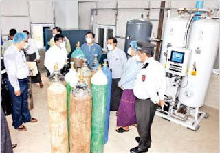 ထို့နောက် ပဲခူးမြို့ ပြည်သူ့ဆေးရုံကြီးတွင် တည်ဆောက်ပြီးစီးထားသော Liquid Oxygen Tank နှင့် တိုင်းဒေသကြီးအစိုးရအဖွဲ့က လှူဒါန်းထားသော တစ်ရက်လျှင်လီတာ ၄၀ဆံ့ အောက်ဆီဂျင် ဆလင်ဒါ ၅၀ ထွက်ရှိသော အောက်ဆီဂျင်ထုတ်သည့် စက်တို့ကို ကြည့်ရှုစစ်ဆေးသည်။
