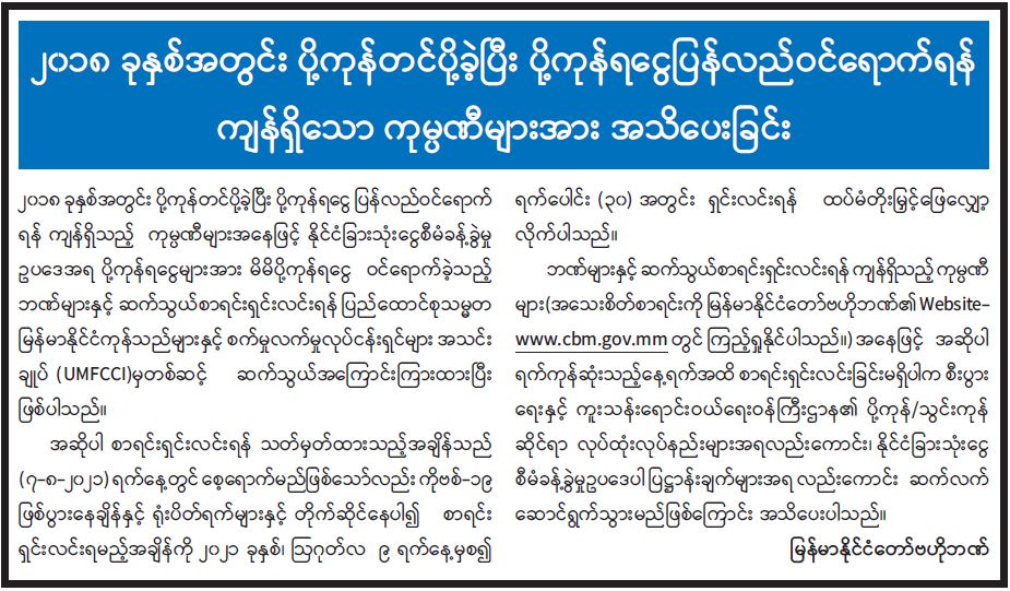၂၀၁၈ ခုနှစ်အတွင်း ပို့ကုန်တင်ပို့ခဲ့ပြီး ပို့ကုန်ရငွေပြန်လည်ဝင်ရောက်ရန် ကျန်ရှိသော ကုမ္ပဏီများအား အသိပေးခြင်း