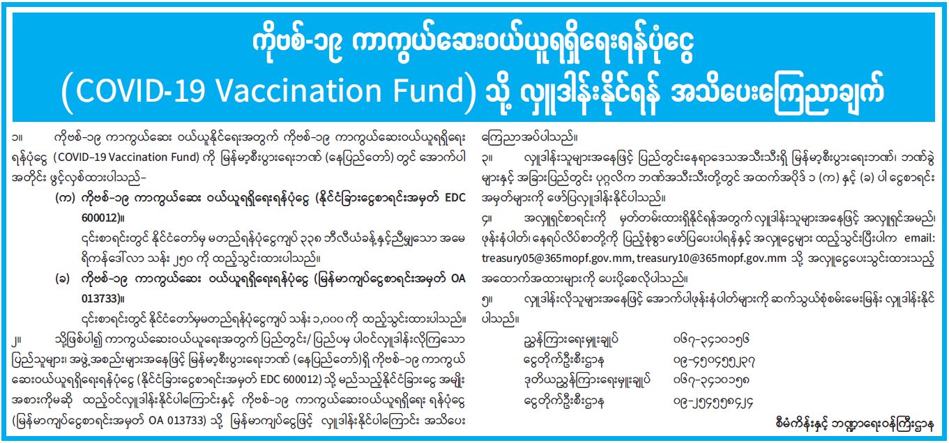 ကိုဗစ်-၁၉ ကာကွယ်ဆေးဝယ်ယူရရှိရေးရန်ပုံငွေ (COVID-19 Vaccination Fund) သို့ လှူဒါန်းနိုင်ရန် အသိပေးကြေညာချက်