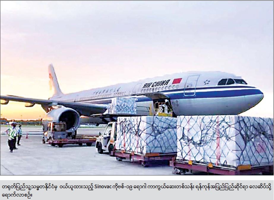 တရုတ်ပြည်သူ့သမ္မတနိုင်ငံမှ ဝယ်ယူထားသော Sinovac ကိုဗစ်-၁၉ ရောဂါ ကာကွယ်ဆေး ၂ သန်းအနက် ဒုတိယအသုတ်အဖြစ် တင်ဆောင်လာသော ကာကွယ် ဆေး ၁ သန်းသည် Air China လေယာဉ်ဖြင့် ယနေ့ညနေပိုင်းတွင် ရန်ကုန်အပြည်ပြည်ဆိုင်ရာ လေဆိပ်သို့ ရောက်ရှိလာသည်။