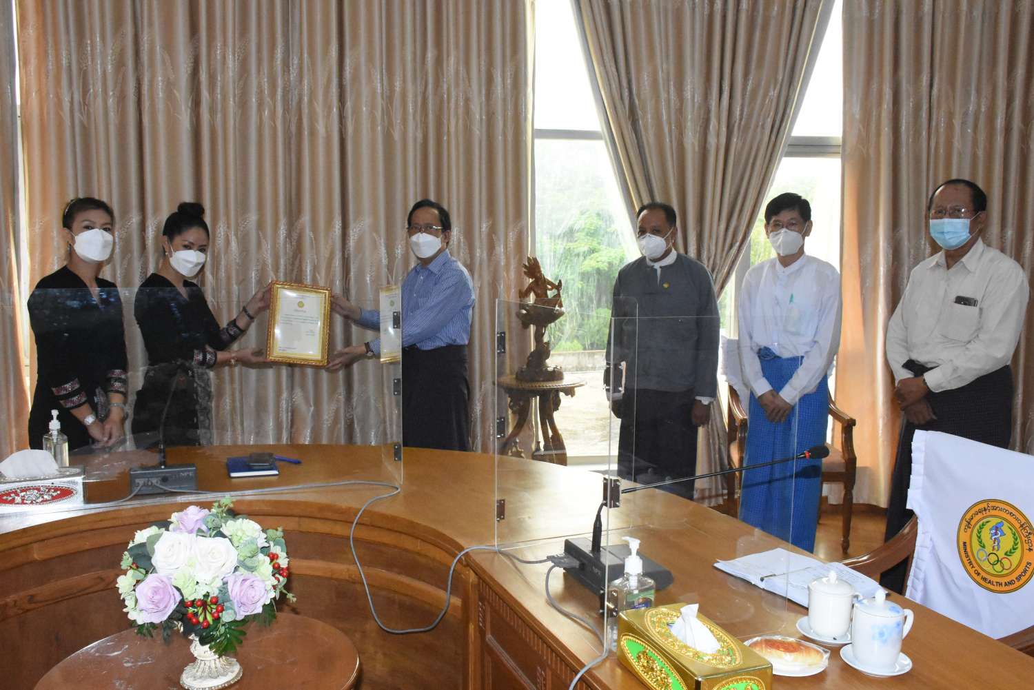 ကိုဗစ်-၁၉ ရောဂါ ကာကွယ်၊ ထိန်းချုပ်၊ ကုသရေးဆိုင်ရာလုပ်ငန်းများတွင် အသုံးပြုနိုင်ရန်အတွက် ကျန်းမာရေးဝန်ကြီးဌာနသို့ ချန်းရှိချင်းယန့် ကုမ္ပဏီလိမိတက်မှ 40 Liter အောက်ဆီဂျင် အိုး(၁၀၀၀) လှူဒါန်းပွဲကို ယနေ့မွန်းလွဲပိုင်းတွင် ကျန်းမာရေးဝန်ကြီးဌာန အစည်းအဝေး ခန်းမတွင် ကျင်းပသည်။