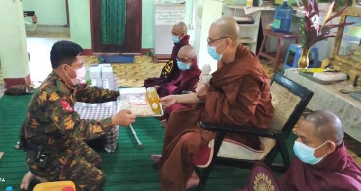 ထိုသို့ ဆောင်ရွက်လျက်ရှိရာ ယနေ့တွင် ရန်ကုန်တိုင်းဒေသကြီး၊ တိုက်ကြီးမြို့နယ်၊ အဖျောက်မြို့၊ အမှတ်(၃)ရပ်ကွက်ရှိ သဲအင်းရိပ်သာကျောင်းတိုက်၊ မန္တလေးတိုင်းဒေသကြီး၊ မန္တလေးခရိုင်၊ မဟာအောင်မြေမြို့နယ်၌ ဝါကပ်သီတင်း သုံးတော်မူကြသော သံဃာတော်များနှင့် သာသနာနွယ်ဝင်သီလရှင် ၃၇၆၉ ပါး၊ ပုသိမ်ကြီးမြို့နယ်၊ လေးကျွန်းမာန်အောင်သာမဏေကျော်စာသင်တိုက်နှင့် ပျော်ဘွယ် မြို့နယ်၊ ရန်အောင်ကျေးရွာ၊ ဇေယုတောင်တောရကျောင်းတို့ရှိ သံဃာတော်များနှင့် သာသနာနွယ်ဝင် သီလရှင်များအား ဆွမ်းဆန် တော်၊ ဆီ၊ ဆား၊ ပဲ အမယ်(၄)မျိုး၊ နေ့ဆွမ်းများ၊ ကိုဗစ်-၁၉ ရောဂါကာကွယ်ရေးအထောက်အကူပြုပစ္စည်းများနှင့် လှူဖွယ် ပစ္စည်းများကို လည်းကောင်း သက်ဆိုင်ရာ တိုင်းဒေသကြီးနှင့် ပြည်နယ်အသီးသီးတို့မှ ဝန်ကြီးချုပ်များ၊ တိုင်းစစ်ဌာနချုပ်များမှ တိုင်းမှူးများနှင့် နယ်မြေခံတပ်မတော် သားများ၊ ဌာနဆိုင်ရာ တာဝန်ရှိသူများက သွားရောက်ဆက်ကပ်လှူဒါန်းပြီး ကျန်းမာ ရေးစောင့်ရှောက်မှုလုပ်ငန်းများ ဆောင်ရွက်ပေးခဲ့ကြကြောင်း သတင်းရရှိသည်။