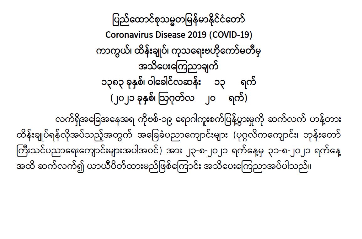 ပြည်ထောင်စုသမ္မတမြန်မာနိုင်ငံတော် Coronavirus Disease 2019 (COVID-19) ကာကွယ်၊ ထိန်းချုပ်၊ ကုသရေးဗဟိုကော်မတီမှ အသိပေးကြေညာချက် ၁၃၈၃ ခုနှစ်၊ ဝါခေါင်လဆန်း ၁၃ ရက် (၂၀၂၁ ခုနှစ်၊ ဩဂုတ်လ ၂၀ ရက်) 08/20/2021