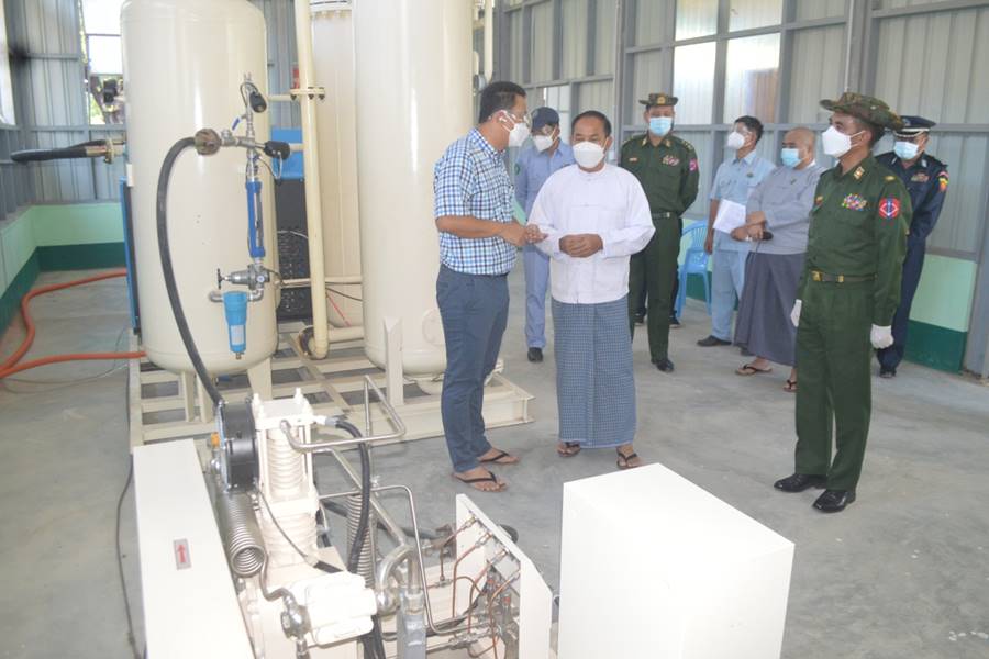 ထို့ပြင် တိုင်းဒေသကြီးနှင့်ပြည်နယ်အသီးသီး၌ အောက်ဆီဂျင်လိုအပ်ချက်များ မရှိစေရေး အတွက် ကျန်းမာရေးဝန်ကြီးဌာနမှ Oxygen Plant များကို တိုးမြှင့်တပ်ဆင် လည်ပတ် လျက်ရှိပြီး တပ်မတော်အနေဖြင့်လည်း တိုင်းစစ်ဌာနချုပ် နယ်မြေအသီးသီး တွင် Oxygen Plant များကို တပ်ဆင်ထုတ်လုပ်ပေးလျက်ရှိရာ ယနေ့တွင် ရခိုင်ပြည်နယ်၊ ကျောက်ဖြူမြို့နယ်၊ စစ်တောတပ်နယ်ရှိ အောက်ဆီဂျင်စက်ရုံမှ အောက်ဆီဂျင်ထုတ်လုပ် နေမှုအခြေအနေများ အားလည်းကောင်း၊ စစ်ကိုင်းတိုင်းဒေသကြီး၊ မုံရွာမြို့၊ အထွေထွေ ရောဂါကု ပြည်သူ့ဆေးရုံကြီး အတွင်းရှိ ရွှေဗျိုင်းဖြူကုမ္ပဏီမှ လှူဒါန်းသော Liquid Oxygen Tank တည်ဆောက်ပြီးစီးမှု၊ အောက်ဆီဂျင်အိုးများ ဖြည့်သွင်းနေမှုနှင့် လူနာများသို့ အောက်ဆီဂျင်ပို့လွှတ်ပေးနေမှု အခြေအနေများနှင့် အိုးဘိုတောင်ရပ်ကွက်ရှိ အောက်ဆီဂျင်ထုတ်လုပ်ရေးစက်ရုံမှ အောက်ဆီဂျင် ထုတ်လုပ်မှု အခြေ အနေများအားလည်းကောင်း၊ မန္တလေးတိုင်းဒေသကြီး၊ ရမည်းသင်းမြို့နယ်၊ သီလဝ (၂)ရပ်ကွက်နှင့် သာစည်မြို့နယ်၊ အမှတ်(၁)ရပ်ကွက်၊ ကြာကန်ဘုန်းကြီးကျောင်း အတွင်းတို့၌ အောက်ဆီဂျင်စက်ရုံ တည်ဆောက်မည့်မြေနေရာများအားလည်းကောင်း၊ သက်ဆိုင်ရာ တိုင်းဒေသကြီး ဝန်ကြီးချုပ်၊ တိုင်းစစ်ဌာနချုပ်များမှ တိုင်းမှူးများနှင့် တာဝန်ရှိသူ များက အသီးသီးသွားရောက်ကြည့်ရှုကြပြီး လိုအပ်သည်များညှိနှိုင်း ဆောင်ရွက်ပေး ခဲ့ကြ ကြောင်း သတင်းရရှိသည်။