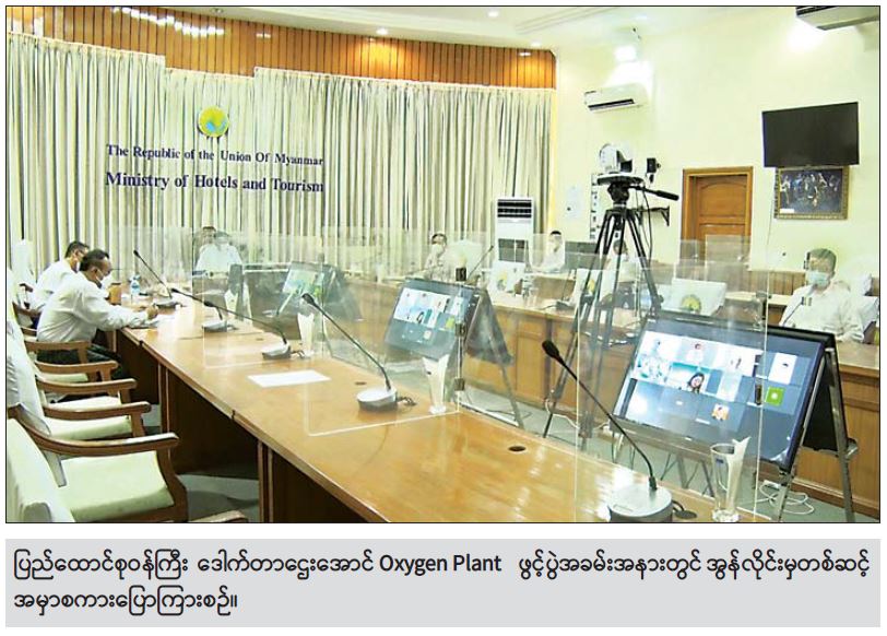 ဟိုတယ်နှင့်ခရီးသွားလာရေးဝန်ကြီးဌာန ပြည်ထောင်စုဝန်ကြီး ဒေါက်တာဌေးအောင်သည် ယနေ့နံနက်ပိုင်းတွင် ရန်ကုန်တိုင်းဒေသကြီး ဗိုလ်တထောင်မြို့နယ် အမှတ်(၃) ကုန်သည် လမ်းနှင့် စန္ဒကူးလမ်းထောင့်၌ တည်ဆောက်ထားသော Oxygen Plant ဖွင့်ပွဲအခမ်းအနားကို အွန်လိုင်းမှတစ်ဆင့် ပါဝင်တက်ရောက်၍ အဖွင့်အမှာစကား ပြောကြားသည်။