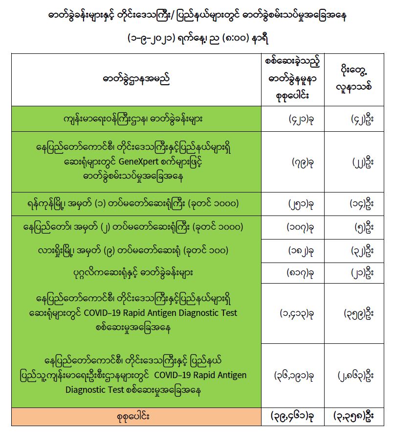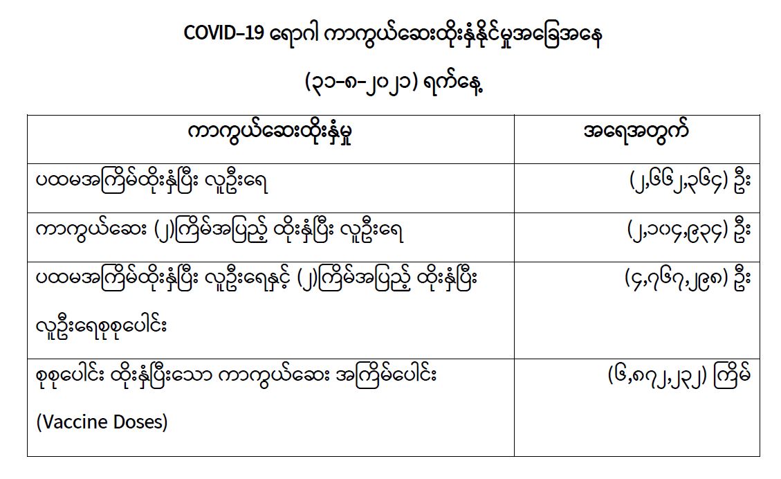 COVID-19 ရောဂါ ကာကွယ်ထိန်းချုပ်ရေးအတွက် တိုင်းဒေသကြီး/ပြည်နယ်များတွင် COVID-19ရောဂါကာကွယ်ဆေးကို ဦးတည်အုပ်စုများသတ်မှတ်၍ ထိုးနှံပေးလျက်ရှိရာ (၃၁-၈-၂၀၂၁) ရက်နေ့အထိ လူဦးရေစုစုပေါင်း (၄,၇၆၇,၂၉၈) ဦးအား ထိုးနှံပေးပြီးဖြစ်၍ ကာကွယ်ဆေးနှစ်ကြိမ်အပြည့်ထိုးနှံပြီးစီးသူ (၂,၁၀၄,၉၃၄) ဦး နှင့် ပထမအကြိမ်ထိုးနှံပြီးစီးသူ (၂,၆၆၂,၃၆၄) ဦးရှိပြီဖြစ်ပါသည်။သို့ဖြစ်ပါ၍ (၃၁-၈-၂၀၂၁) ရက်နေ့အထိ မြန်မာနိုင်ငံတွင် COVID-19 ရောဂါကာကွယ်ဆေး အကြိမ်ရေ စုစုပေါင်း (၆,၈၇၂,၂၃၂) ကြိမ် ထိုးနှံပြီး ဖြစ်ပါသည်။