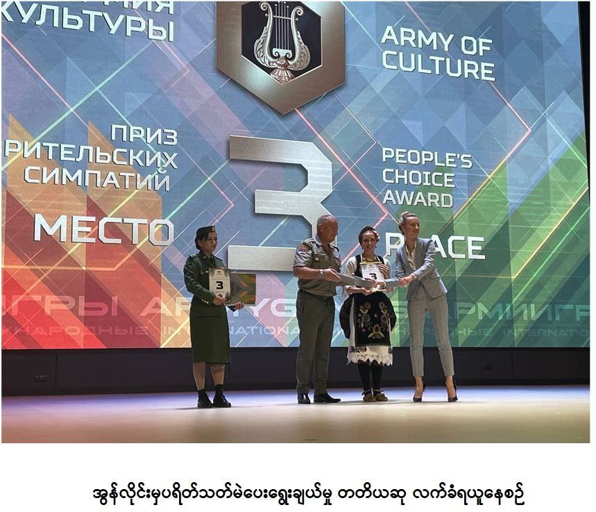 ထိုသို့ ဝင်ရောက်ယှဉ်ပြိုင်လျက်ရှိသည့် မြန်မာ့တပ်မတော်မှ ယဉ်ကျေးမှု တပ်ဖွဲ့ဝင်များသည် ဩဂုတ် ၂၂ ရက်မှစတင်၍ နိုင်ငံပေါင်း ၁၅ နိုင်ငံမှ ပြိုင်ပွဲဝင် ရိုးရာယဉ်ကျေးမှု တပ်ဖွဲ့ဝင်များနှင့်အတူ ပြိုင်ပွဲအသီးသီးတွင် ဝင်ရောက်ယှဉ်ပြိုင်ခဲ့ရာ ရိုးရာဝတ်စုံဖြင့် ဖျော်ဖြေတင်ဆက်ပြသမှုတွင် ပထမဆု၊ ရုရှားသီချင်းဖြင့် တစ်ဦးချင်းသီဆိုဖျော်ဖြေတင်ဆက်မှုတွင် ဒုတိယဆု၊ နိုင်ငံ့ရိုးရာ ယဉ်ကျေးမှုကို ပေါ်လွင်ထင်ဟပ်အောင်ဖျော်ဖြေတင်ဆက်ပြသမှုတွင် ဒုတိယဆု တို့ကို ဆွတ်ခူးရရှိခဲ့ သည့်အပြင် အွန်လိုင်းမှတဆင့် ပရိသတ်များ၏ မဲပေးရွေးချယ်မှုတွင်လည်း တတိယဆုကို ရရှိ အောင် စွမ်းဆောင်နိုင်ခဲ့သည်။